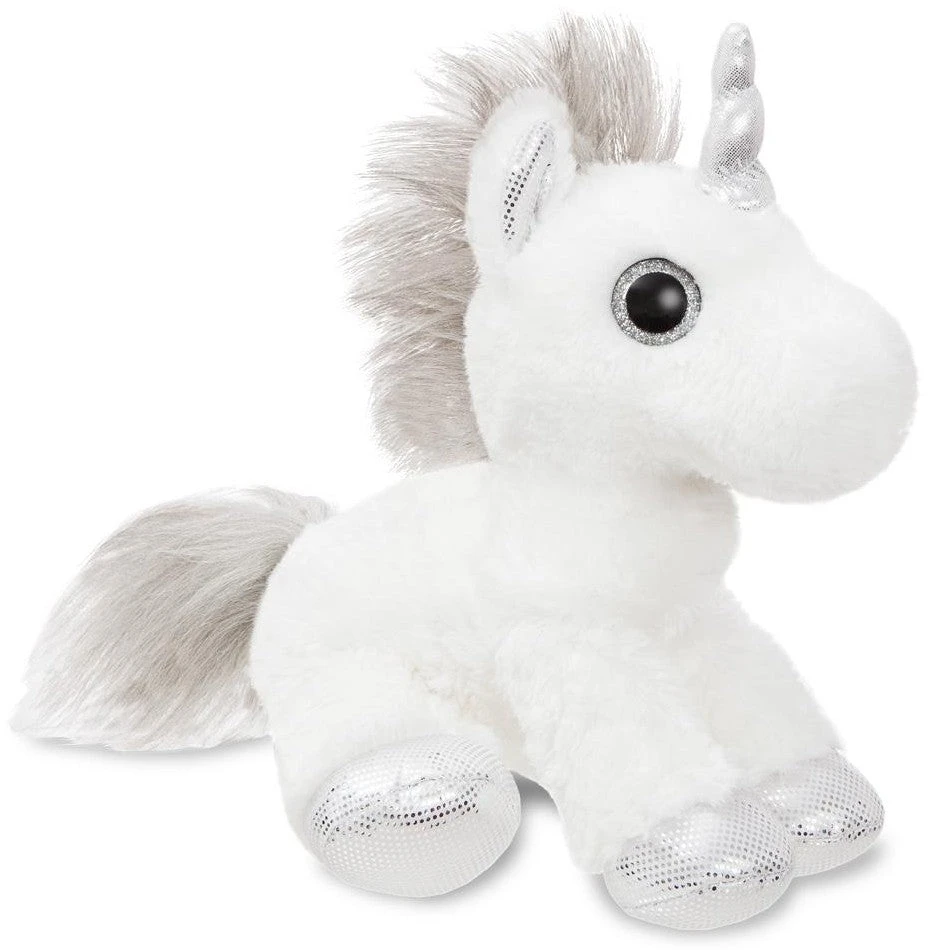 This super cute soft unicorn in white has glittery silver hooves, silver unicorn horn and a soft grey mane and tail. Twilight’s’s eyes are big and sparkly with silver glitter.