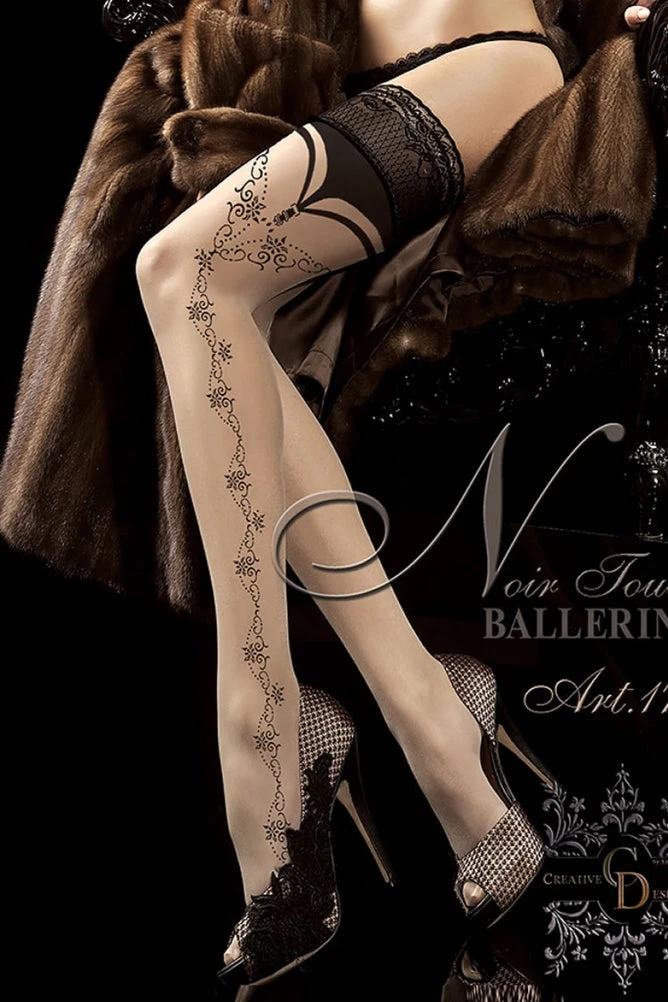 Elegant hold ups in beige with faux suspender design. Delicate black detailing down the side of the leg. All items come in branded Ballerina packaging.