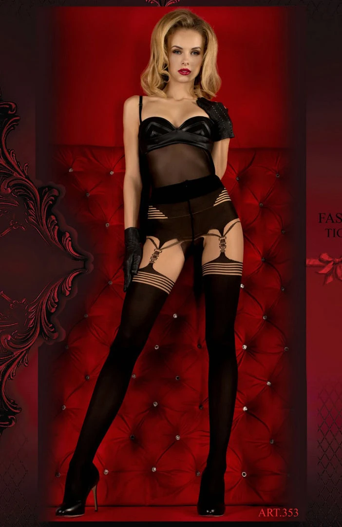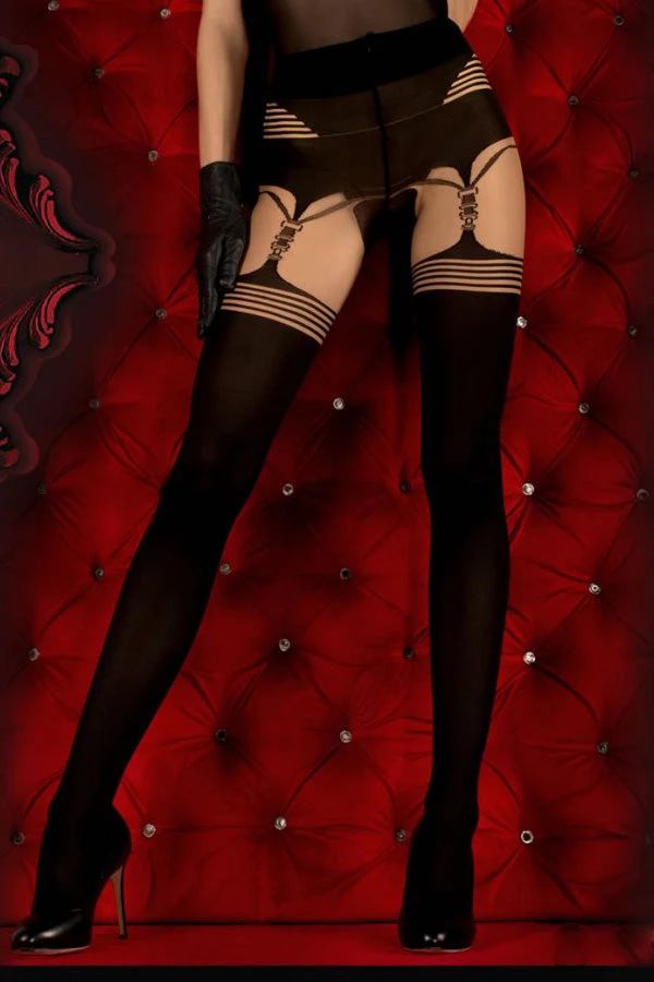 These tights really are quite striking! A gorgeous pair of tights in Nero (Black) with a touch of Skin colour. At the top of the tights there are striking stripes inside a trapezium shape which sits on the outer sides of the legs. There are also more stripes on the thigh which go around the leg, and a buckle like design which creates a faux-suspender effect. This product is part of the Hush Hush collection by Ballerina and is presented in luxury embossed packaging.