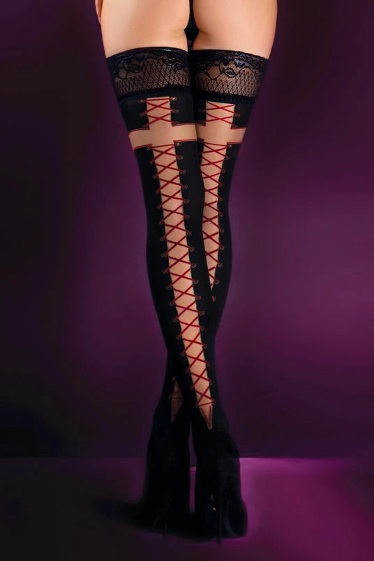 From the Ballerina Special for You Collection. This is a lovely pair of hold ups in Black and Skin. They have a stunning criss-cross pattern down the centre back in a contrasting colour. An exclusive product which is delicately perfumed. Available in two sizes. The item is presented in beautiful Ballerina packaging.