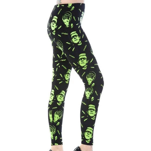 Black Gothic Alternative Leggings with elastic waistband featuring a Green Print pattern depicting Frankenstein, Scars, Lightning and the Bride of Frankenstein.