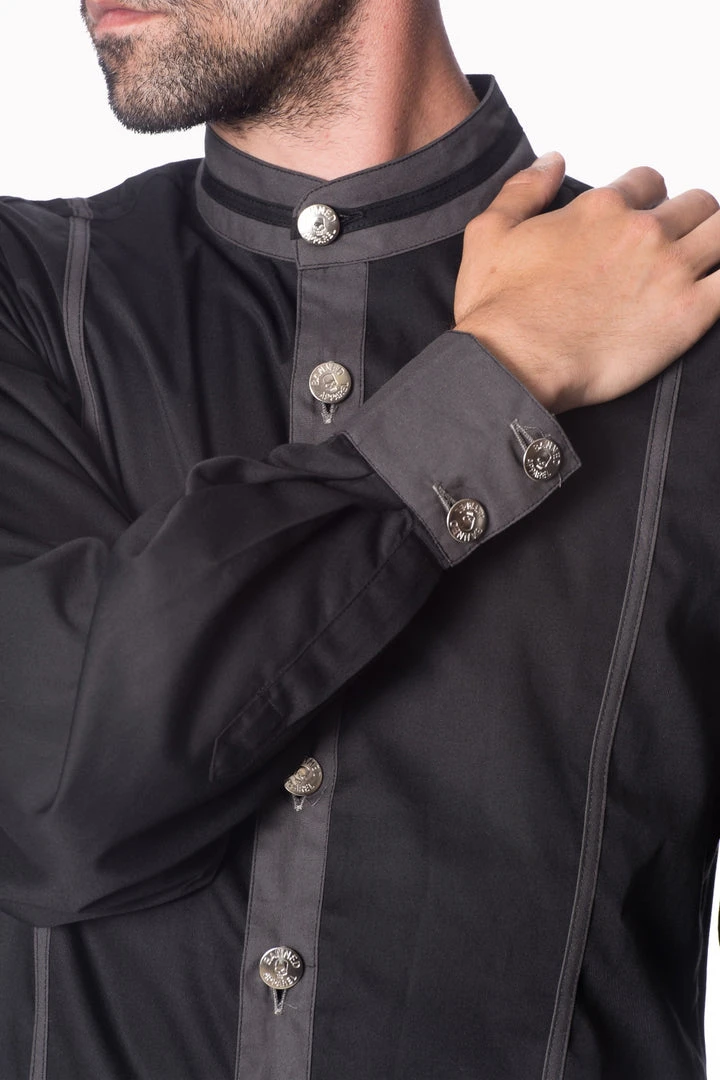 This stylish alternative shirt for men is a polyester rayon mix in black with eyecatching contrast grey stripe detail down each side at the front, down the centre and and around the cuffs and collar which is a high collar style without points.The shirt fastens down the front with silvertone jean style buttons which feature the banned skull logo.