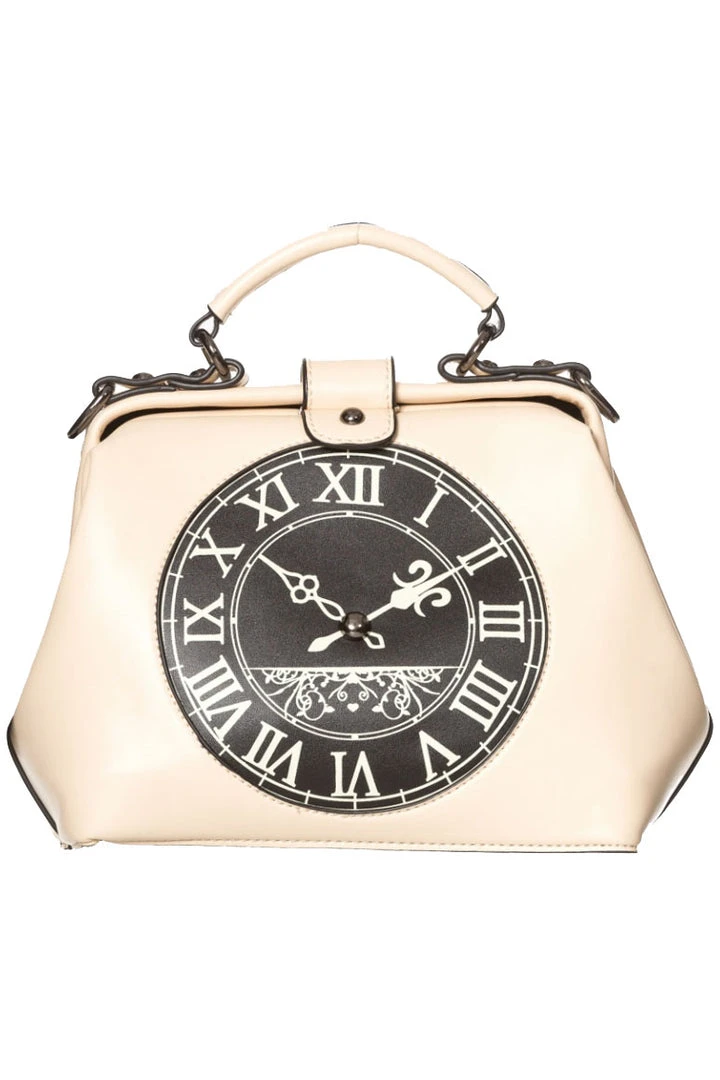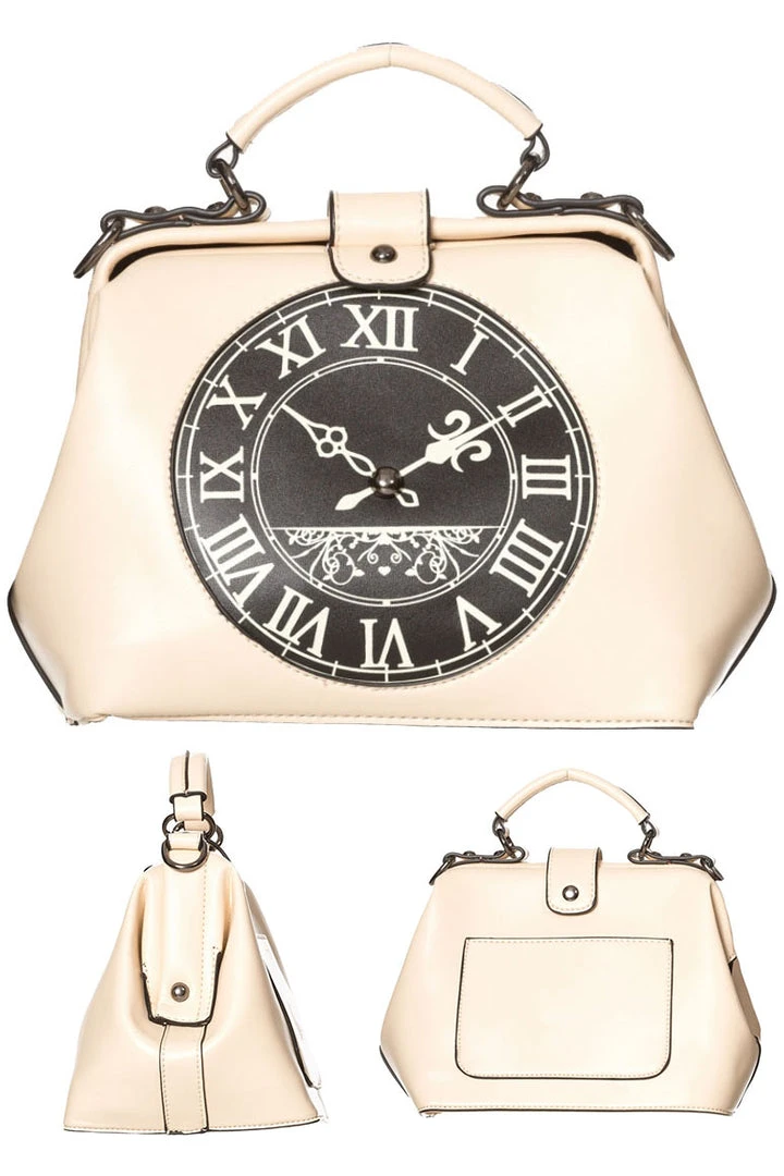 From Banned Alternative Wear this great Steampunk friendly vintage style hand bag in Creamy White leather look matte pvc is lined in black and features a circular black clock face with cream roman numerals on the front. The bag itself is slightly reminiscent of a small vintage Doctor’s bag with swivel frame opening. The bag has a magnetic press stud closure on the top strap. Inside the bag there is a small zip pocket and two open pouch pockets for small accessories. The back of the bag also has a small pouch pocket. There is a carry handle on the top of the bag and also a detachable clip on shoulder strap.