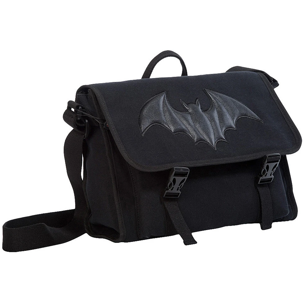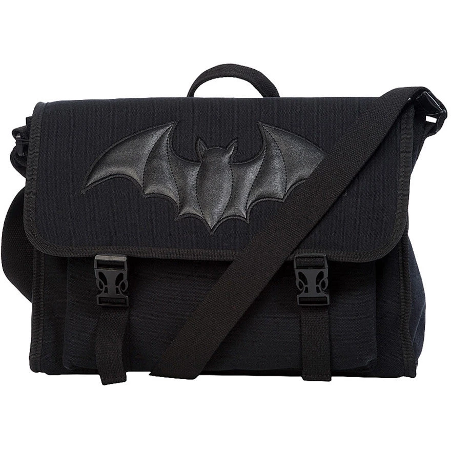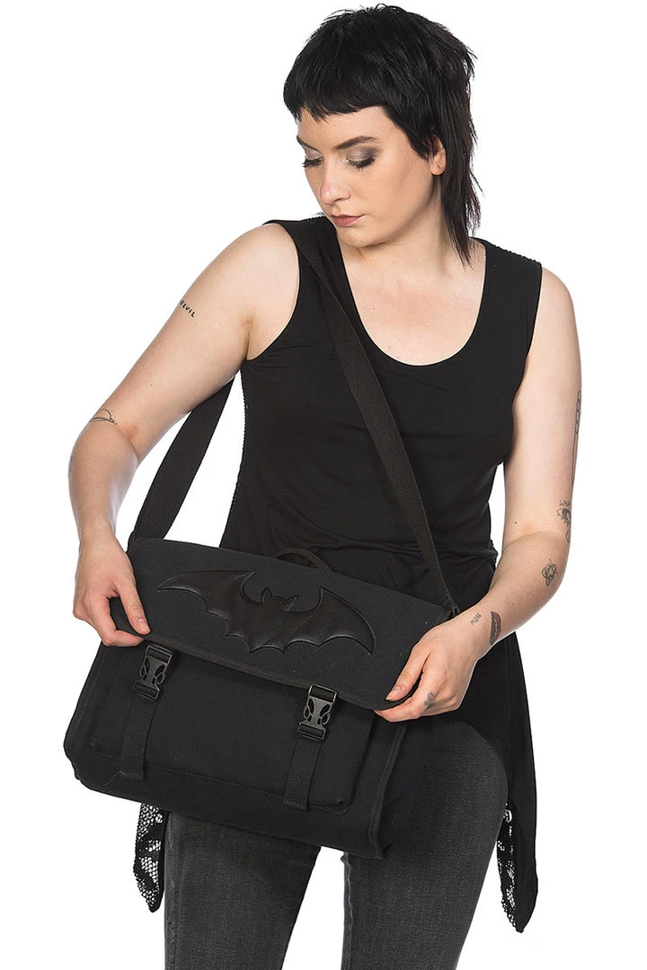 Add a touch of gothic style to your outfit with our canvas messenger bag. Wear it on your shoulder cross body or carry it with the top handle. Front embossed bat detail graces the front overlay and secured with two side release clips.
