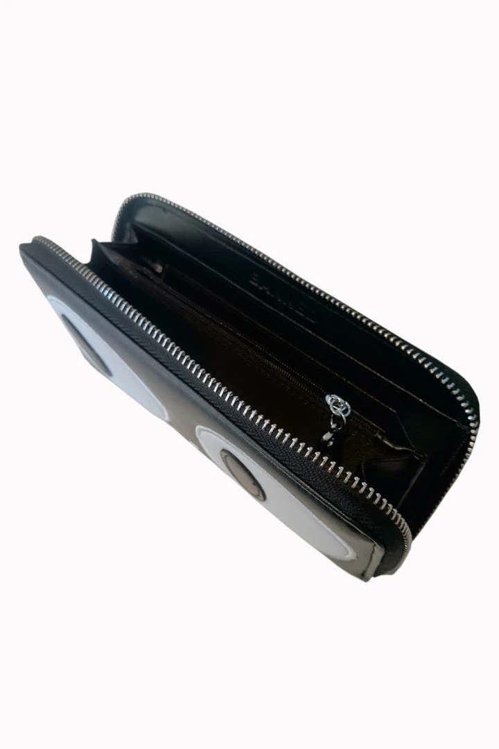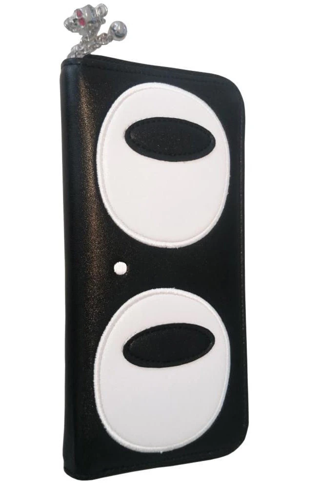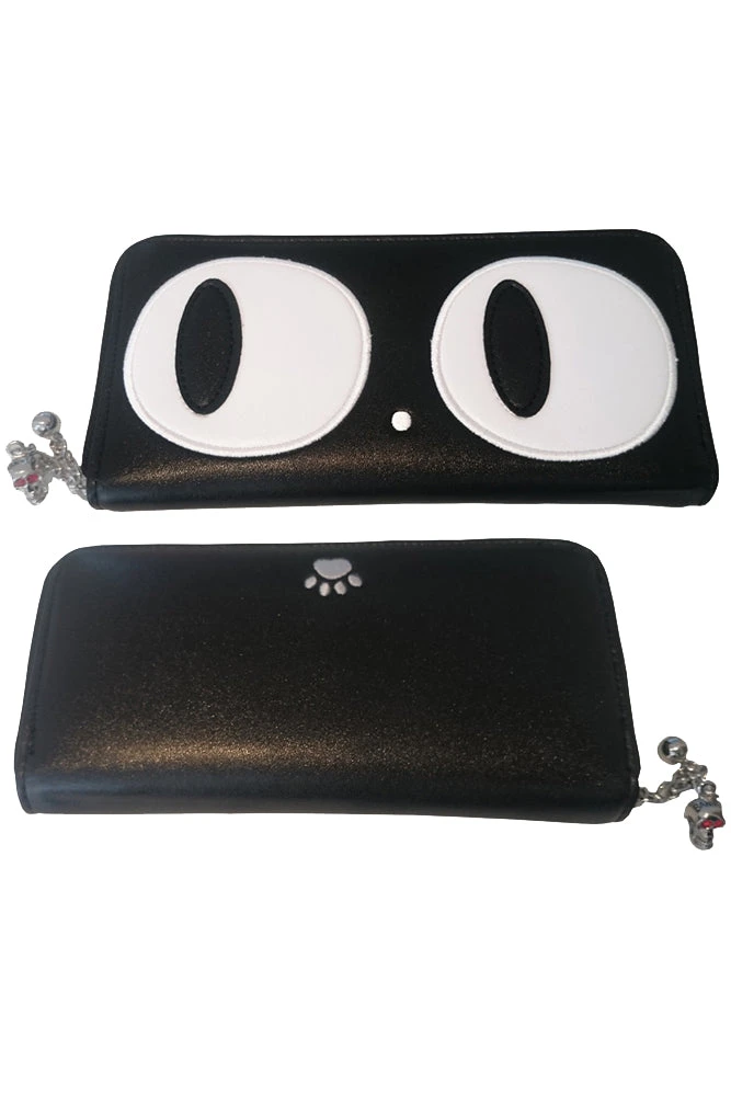 From Banned Alternative Wear, this great gothic purse in leather look matte pvc zips opens to reveal two sides of the purse, separated by a central zip pocket for loose change. Each side of the purse has space for notes and compartments for cards. The main zipper pull on the outside has two lengths of gunmetal silver tone chain with a skull one one and ball on the other. The front of the wallet features two stitched white leather look cats eyes and embroidered nose, while the back has an embroidered white paw print.