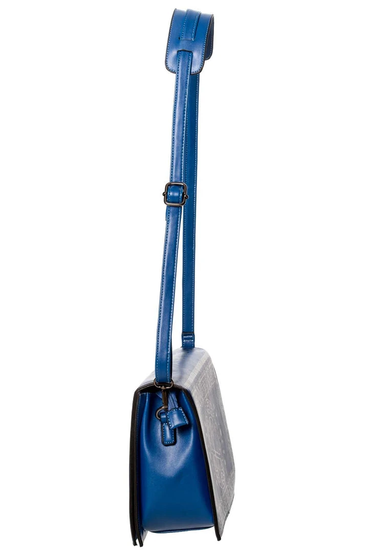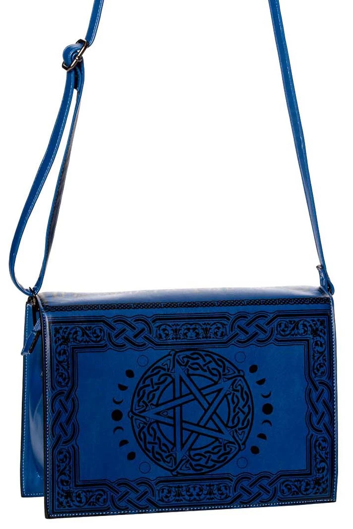 From Banned Alternative Wear this absolutely stunning shoulder bag is shaped like a book and made from a beautiful teal blue faux leather fabric with black print design featuring pentagrams, moon and celtic knotwork patterns. The bag closes with three magnetic press studs – two underneath the flap and one on a small strap at the front. The bag has a clip on shoulder strap with adjustable padded section. Underneath the front flap of the bag, the main compartment closes with a zip and inside there is small zip pocket and open pouch pockets on the inside of the bag and the bag.
