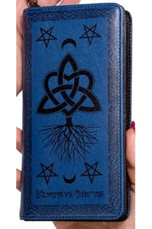 From Banned Alternative Wear, this great gothic purse in Turquoise Teal blue leather look matte pvc has a press stud fastening on one side which opens to reveal space for cards and ID while the other side of the wallet has a zip around closure with two sections for coins. The main zipper pull on the outside has two lengths of gunmetal silver tone chain with a skull detail on the end. The front k of the wallet features a celtic knotwork style tree of life design and the back has a pentagram with celtic knotwork surround and luna moon phases. The edge of the wallet has text is is designed to look like the spine of a book.