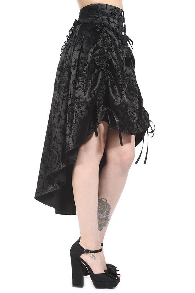 This vintage gothic style skirt is stunning with its high waist, open front and white cameo buttons detailing the waistband. The skirt is long and black with a flocked vine pattern complimented with cross, roses and cameo details. The skirt fastens with a zip at the back for easy dressing. There are rouching channels on each side at the front to adjust the height of the front of the skirt. Made from 100% polyester the skirt is light and easy to wear and will make a great addition to your gothic wardrobe.