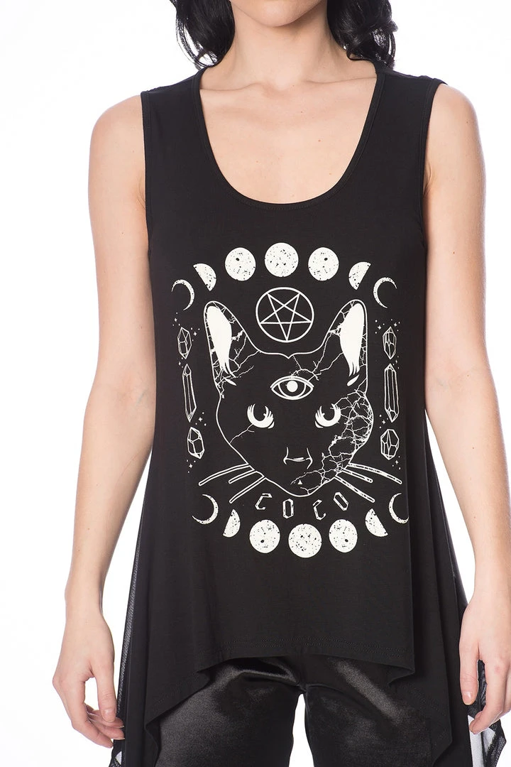 Cat, Moon and Pentagram Glow in the dark top. Vest top with screen placement print and see through back. Drop side.