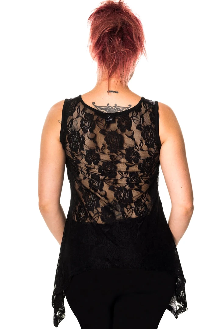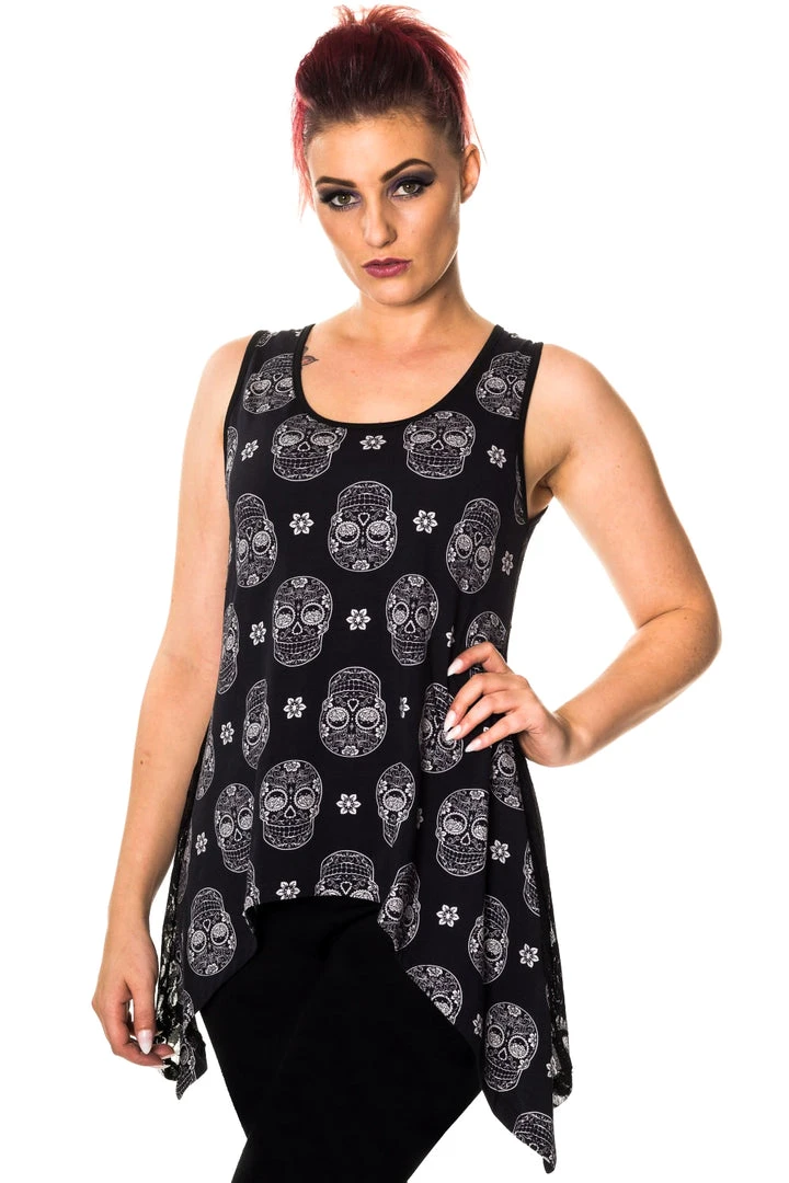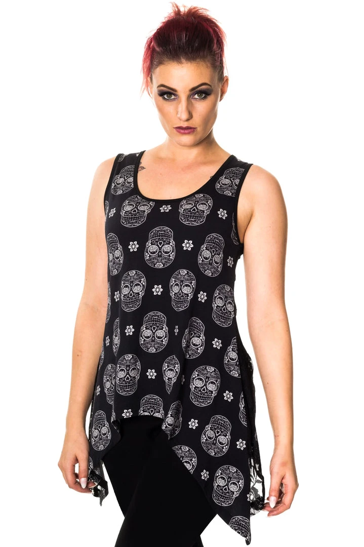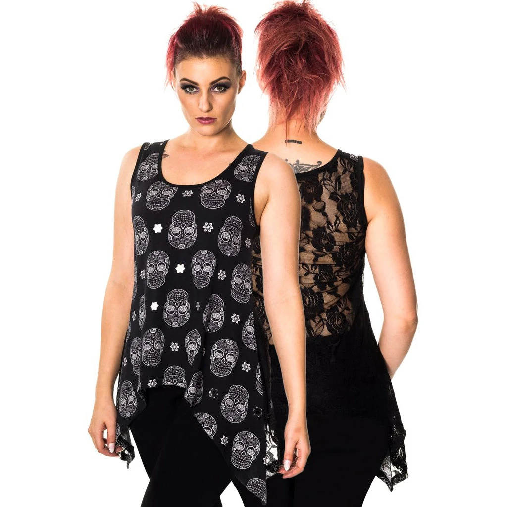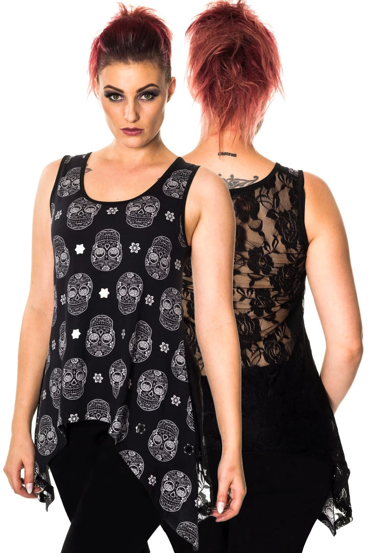 Gothic Vest Top with Dipped Hem style cut and white print design featuring Mexican of the Dead style skulls and full floral lace back panel.