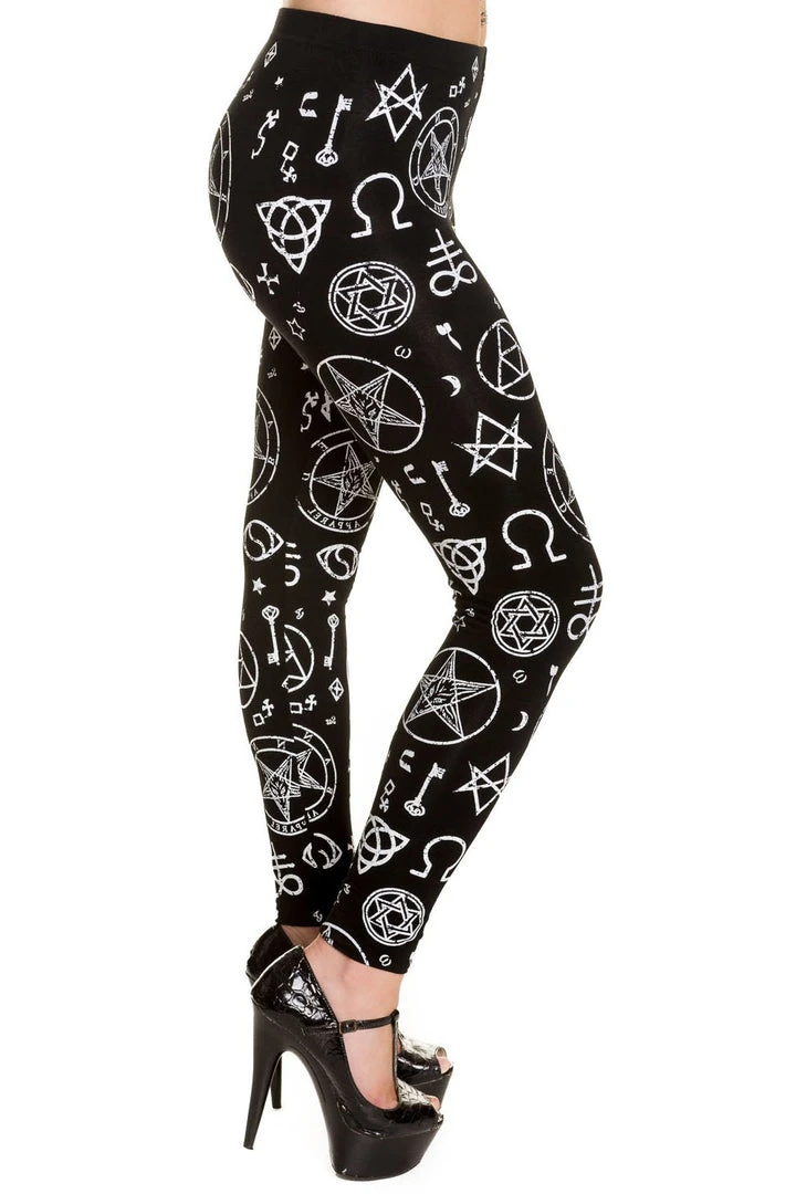 Black Alternative Gothic Leggings with elastic waistband in Viscose Spandex mix featuring a White Print pattern depicting Pentagrams and various other magical symbols.