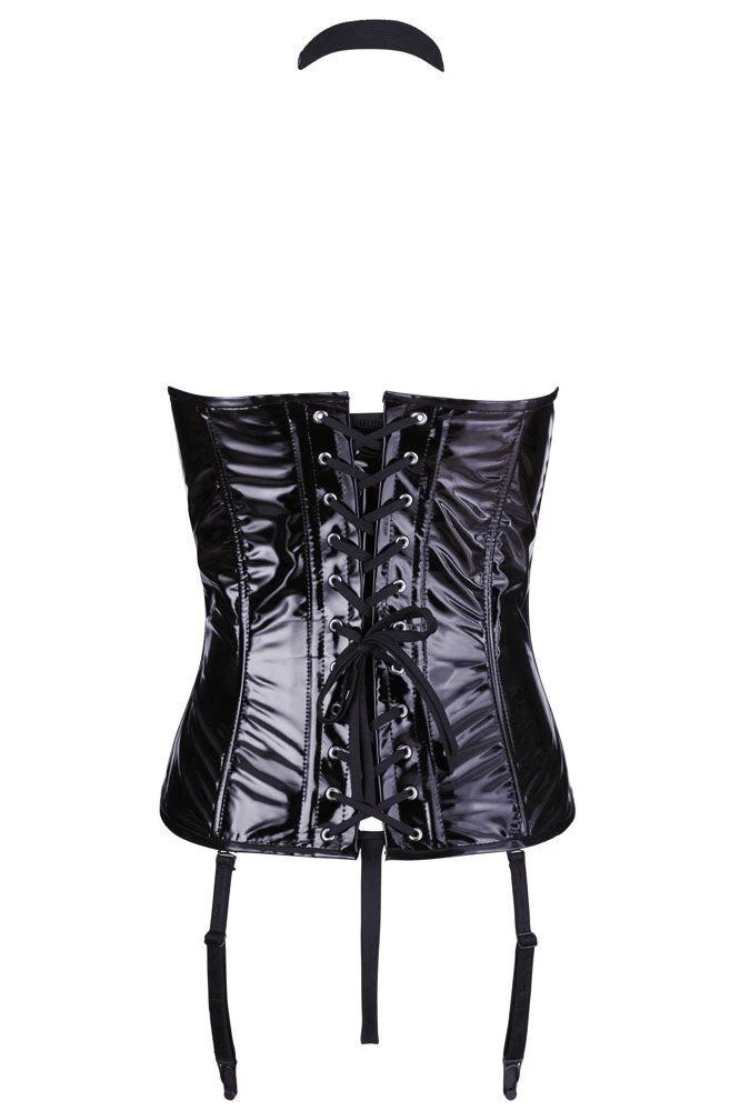 For a shining accentuation of female curves! Vinyl corsage with halterneck and bones. It has a zip and lacing at the front and also lacing with a piece of material underneath it at the back. The suspender straps are adjustable and removable. String included.
