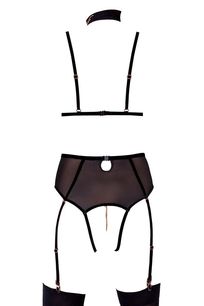 Stylish, inviting and revealing! Open cup, powernet body from Abierta Fiena with a completely open crotch area, stretchy velvet straps and rose-gold coloured decoration. The bra and suspender straps can be adjusted. The suspender straps can be removed. There is an adjustable cleavage strap and a choker (with a button at the back) that has decorative chains around it. The cleavage strap and choker are also removable. The small chains in the cleavage area with snap hooks and the chain in the crotch area with a decorative ring are also removable. The back of the body is in a 2-piece look. There are two clip fasteners on the bra and a panty/suspender belt waistband.