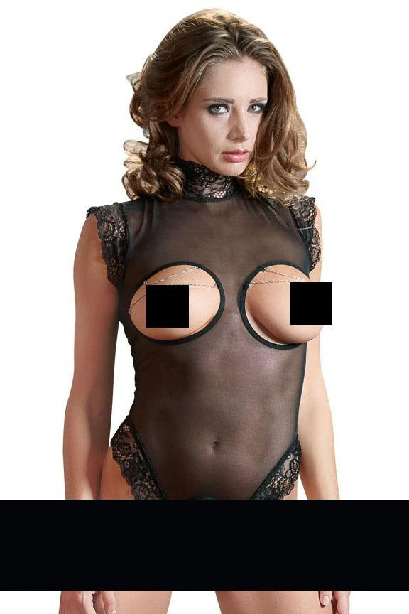 Extremely attractive! Black transparent body with lace trimmings on the sleeves, collar (2 buttons at the back) and around the legs. Breasts and crotch are open and decorated with detachable chains. Black.