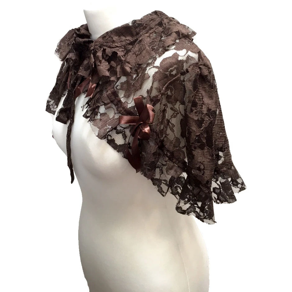 Brown bolero shrug shoulder cape in brown floral lace with lace tie at the neck and satin ribbon decoration. Looks great with a corset and the perfect compliment to your steampunk wardrobe.
