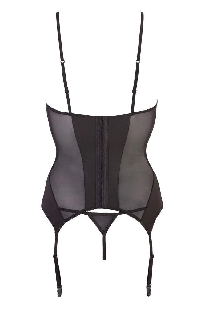 Basque and string thong made of transparent black power net fabric. The basque features slightly transparent inserts, a frontal decorative lacing and rhinestone details. Hooks in the back. Adjustable straps.