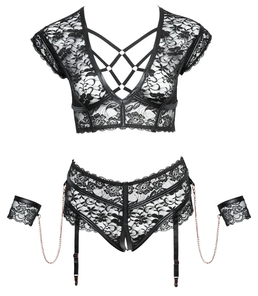 Delicate late for captivating moments of pleasure! Bra and crotchless suspender briefs from Cottelli BONDAGE made out of soft, stretchy lace with matte look stripes and rose-gold coloured details. The lace handcuffs provide captivating moments of pleasure. The handcuffs can be attached to the rings on the sides of the briefs thanks to the snap hooks. The wireless bra is slightly longer than normal bras and it is also has stretchy straps over the low cut cleavage area. The bra has a clip fastener at the back of the neck and a hook fastener at the back. The briefs are invitingly open in the crotch area. The adjustable suspender straps can be removed.