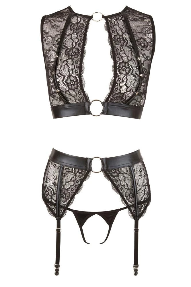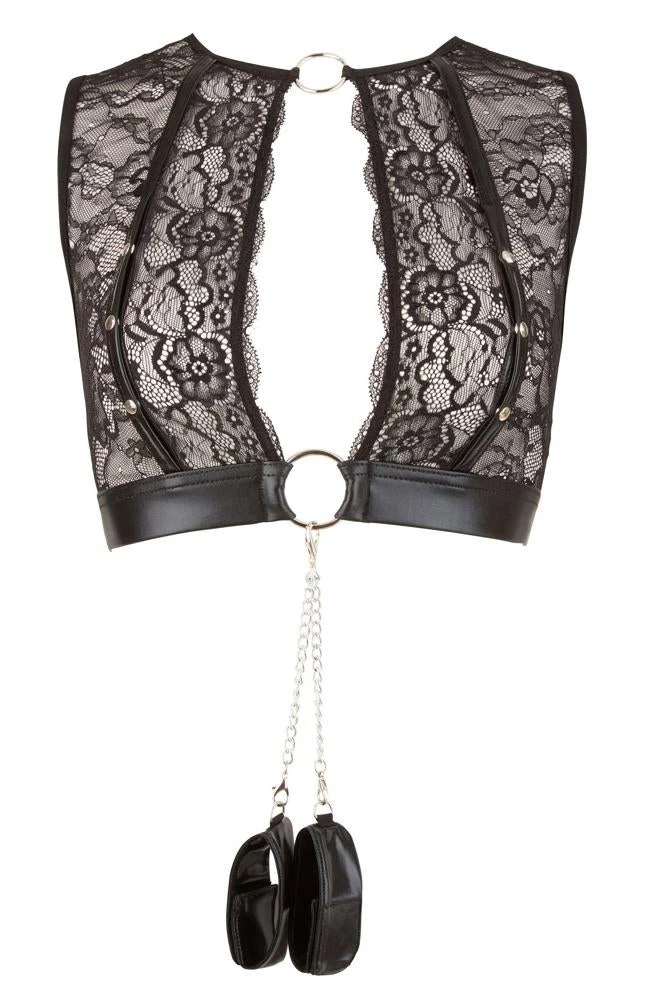 3-piece lingerie set including handcuffs! Top, suspender belt and crotchless string made out of transparent lace and black wetlook. The highlight: the press studs over the breasts that are extremely easy to undo and the handcuffs with hook and loop fasteners that can be quickly attached to the decorative rings on the top or the suspender belt with the snap hooks. This means that this lingerie set can quickly be turned into a special bondage set for beginners!