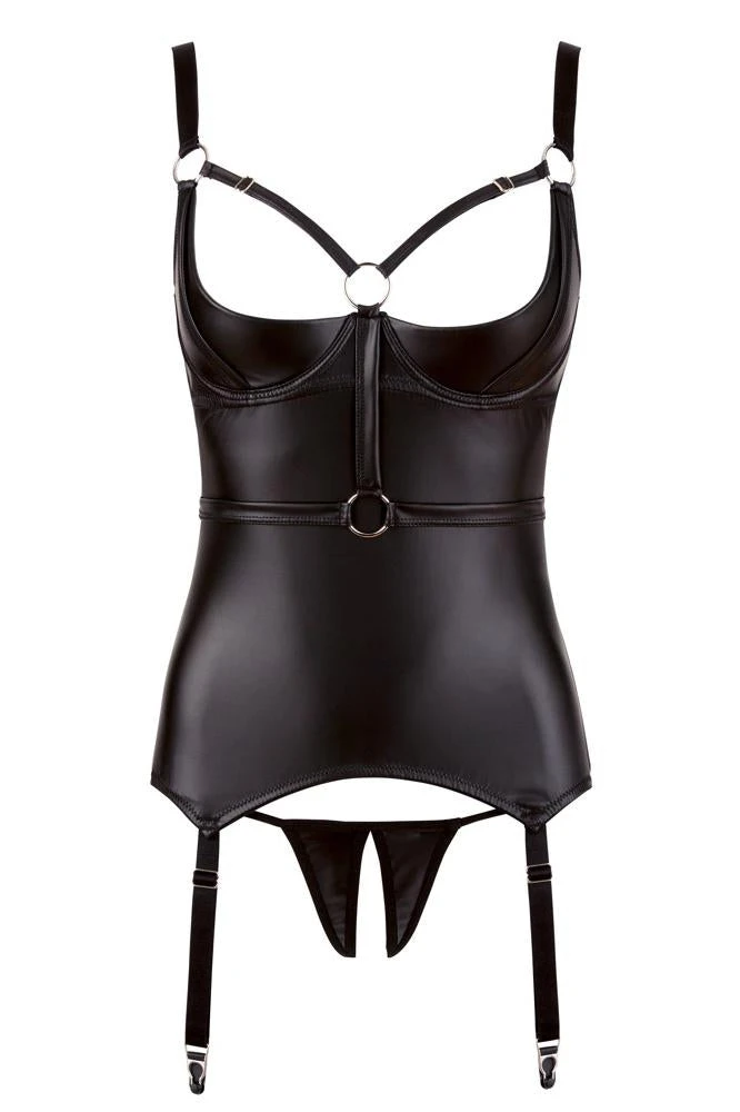 Underwired basque in a matte black look with metal details. With adjustable straps over the naked breasts, a strap over the stomach and handcuffs with hook and loop fasteners at the back. The bra straps and 6 suspender straps are adjustable. Includes a crotchless string.
