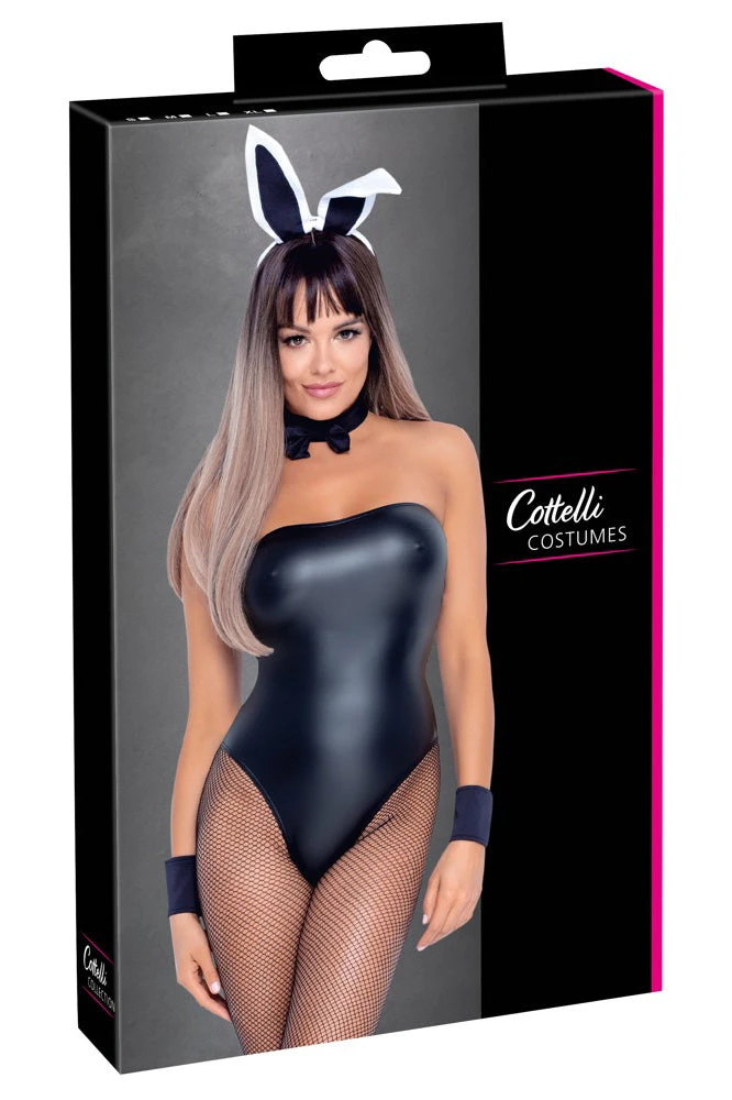 A complete set for sexy bunnies! 5-piece Bunny Set from Cottelli Costumes that includes a body with a removable bunny tail, cuffs, a headband with ears and a collar with a bow tie. A stretchy, strapless tube body in a beautiful matte look. The feather pompom can be attached over the bum via hook and loop fasteners. The collar has a stylish bow tie at the front and hook and loop fasteners at the back. The cuffs both have 2 buttons. The ears on the headband are bendable.