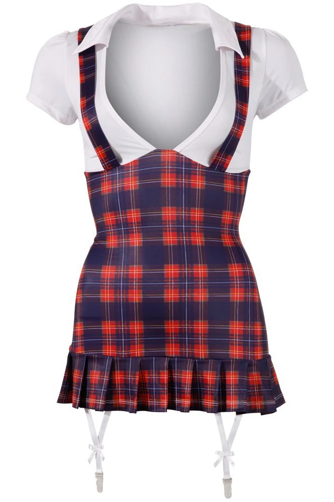 Become a schoolgirl! This dress is the perfect school uniform. The top part is a low cut white blouse with short sleeves and a collar. There is also a sewn-on blue/red chequered skirt part with straps that go over the breasts and criss-cross at the back. With a short pleated hem and two white suspender straps at the front.