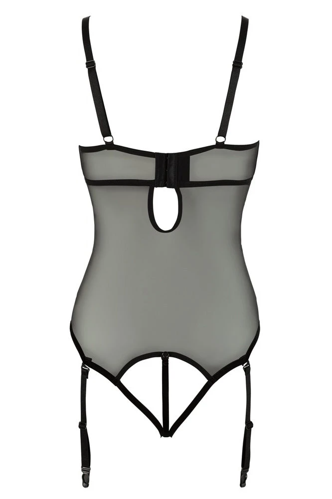 With underwire for a nice cleavage, attached velvet ribbons in the front and – the highlight! – Removable string part (press studs). Adjustable straps and suspenders, hook fastening in the back.