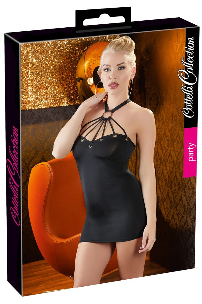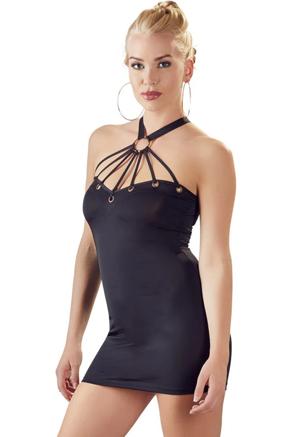 Elegant and sexy at the same time! Figure-flattering halterneck mini dress. With decorative eyelets, big decorative brass-coloured rings and strap detail in the cleavage area. The adjustable halterneck straps are crossed at the back.