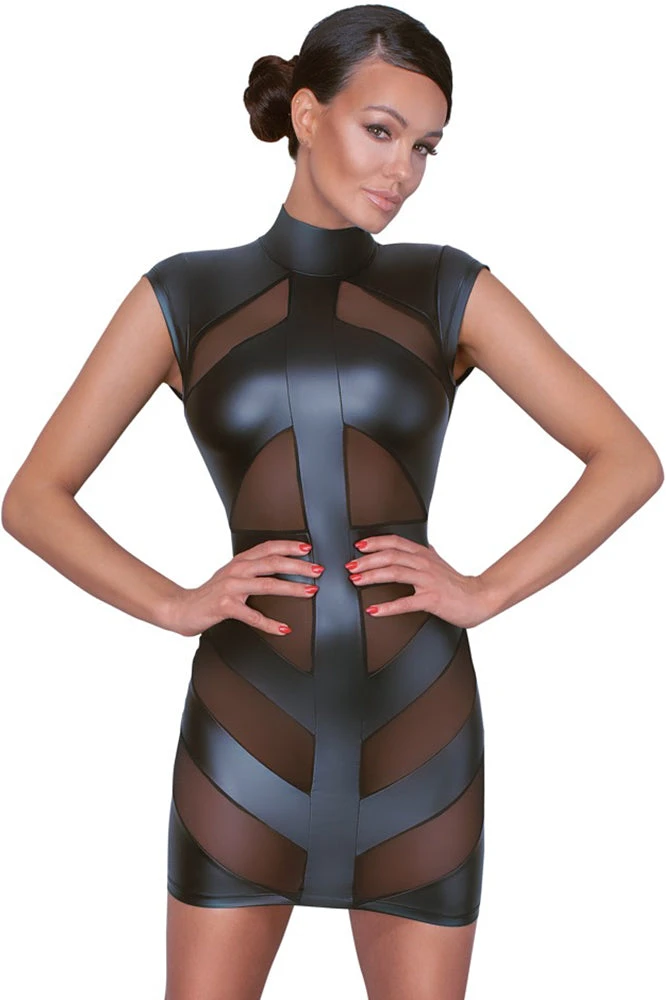 Hot dress that emphasises curves! A short dress from Cottelli PARTY that is fitted at the waist and made out of black matte look material. There are also powernet inserts at the front. The stand-up collar has 2 buttons at the back of the neck. There is a large oval cut-out at the back. It is soft and stretchy for a comfortable fit.