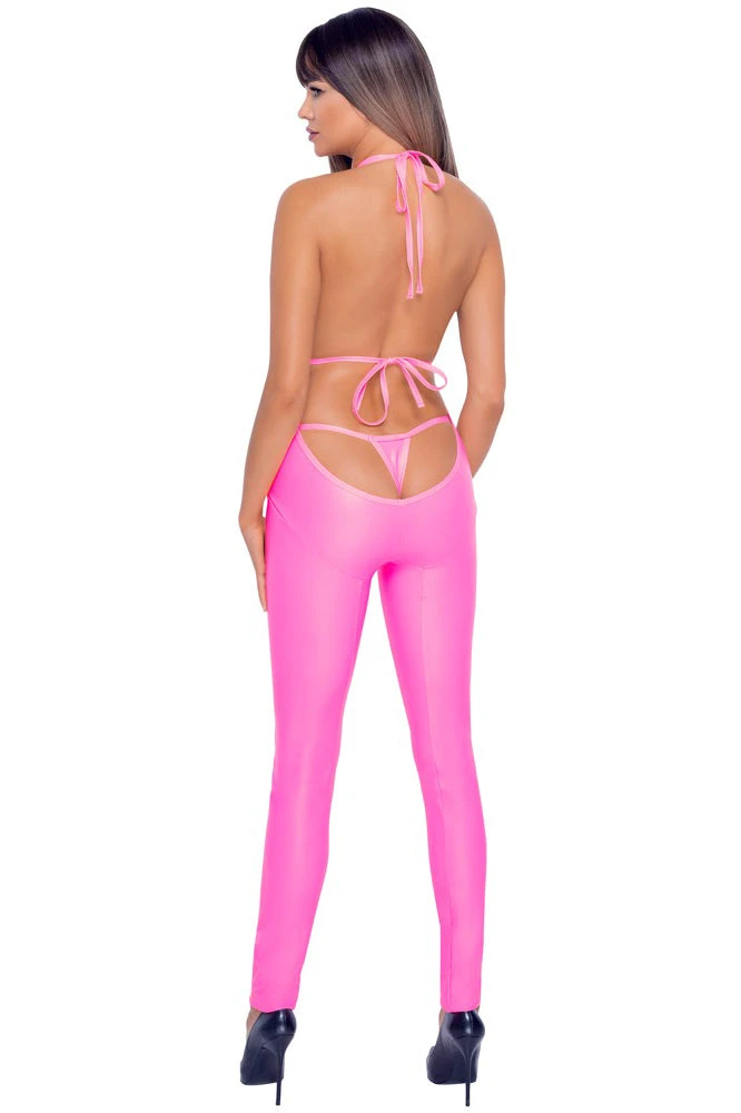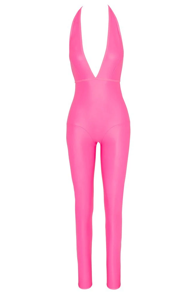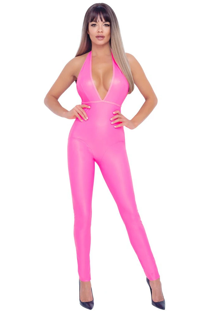 Eye-catcher in a bright pink colour! Jumpsuit with a string from Cottelli PARTY made out of eye-catching, neon pink, shiny matte material. The jumpsuit with slim and long legs is very low cut and stops at the belly button. It has a halterneck that ties. The back is almost entirely open to the bum except for a waist strap that is tied at the back. The soft and stretchy material guarantees a comfortable and perfect fit.