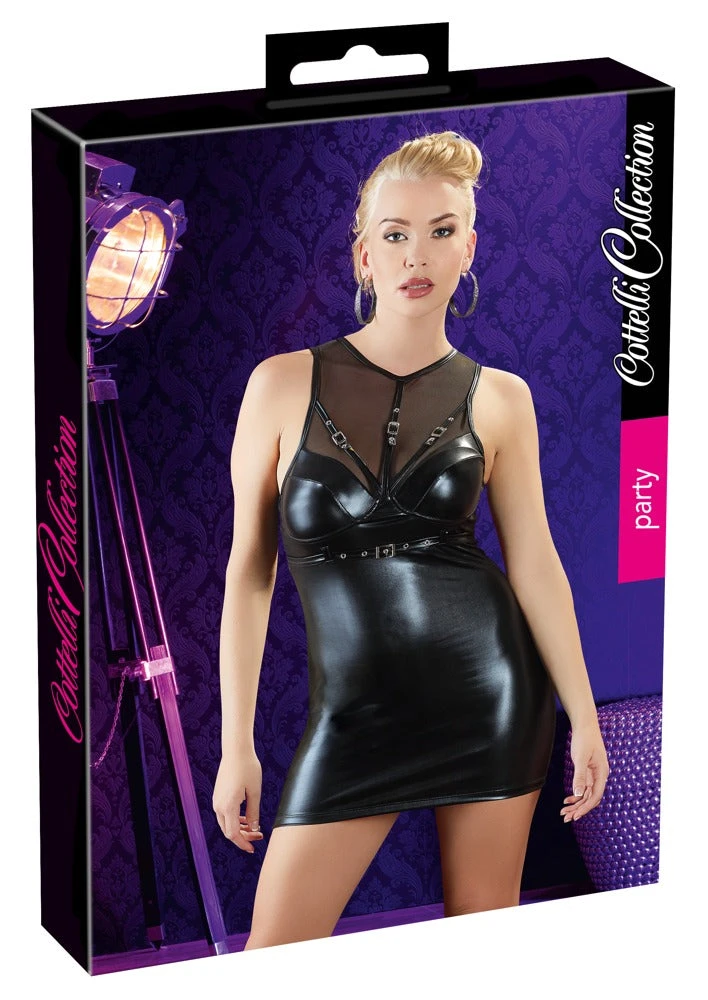 Incredibly sexy version of the little black dress! Tight-fitting mini dress in a trendy wetlook with a transparent powernet insert above the elaborate cups. There are three decorative straps with buckles in the cleavage area. Below the cups is another decorative strap with a buckle.