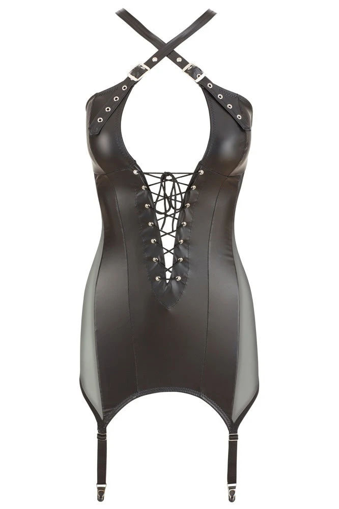 An erotic eye-catcher! Show yourself off in this tight-fitting dress with suspender straps that is made out of black matte look material and has powernet inserts at either side – your partner won’t be able to keep their hands off you! There is lacing at the front over the low-cut cleavage area. There are criss-cross straps at the front and the back. The bra and suspender straps are adjustable.