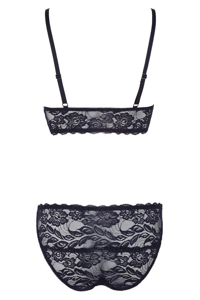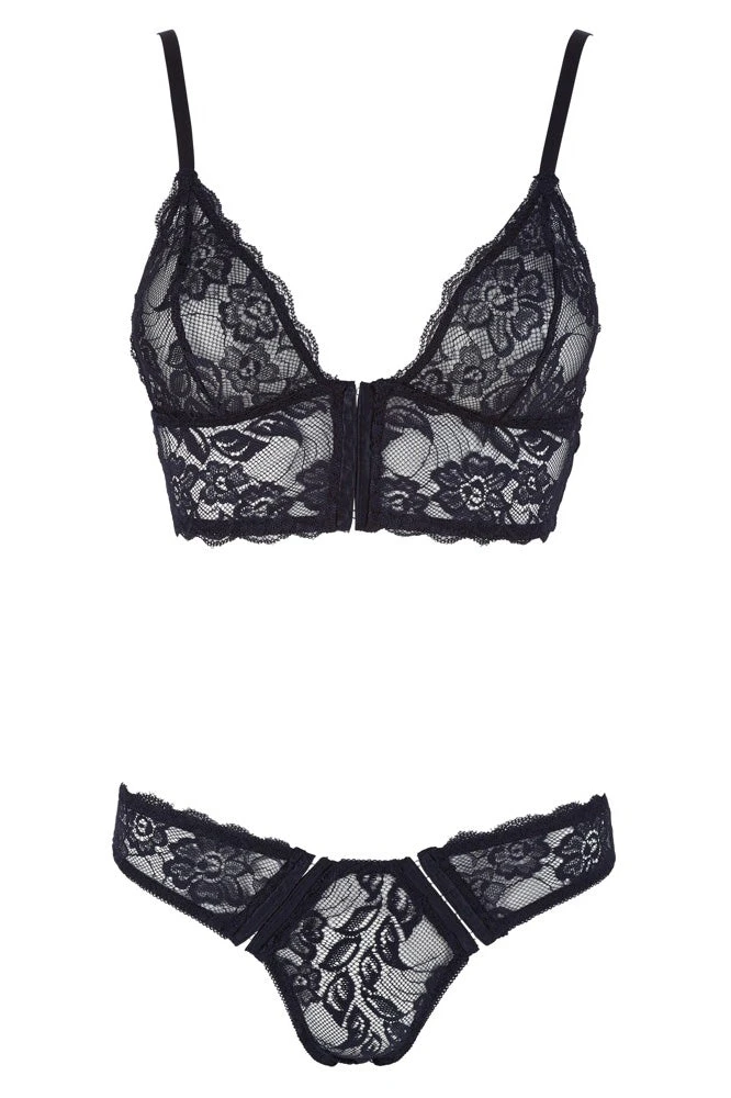 Seductive and sexy – even during the day! Bralette with adjustable straps and a hook fastener at the front. Includes matching briefs with two hook fasteners. Both pieces are made out of soft, stretchy floral lace.