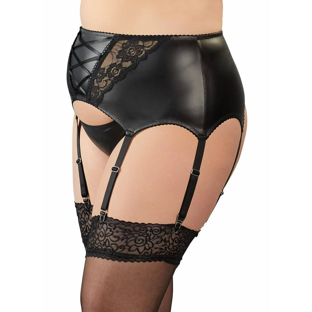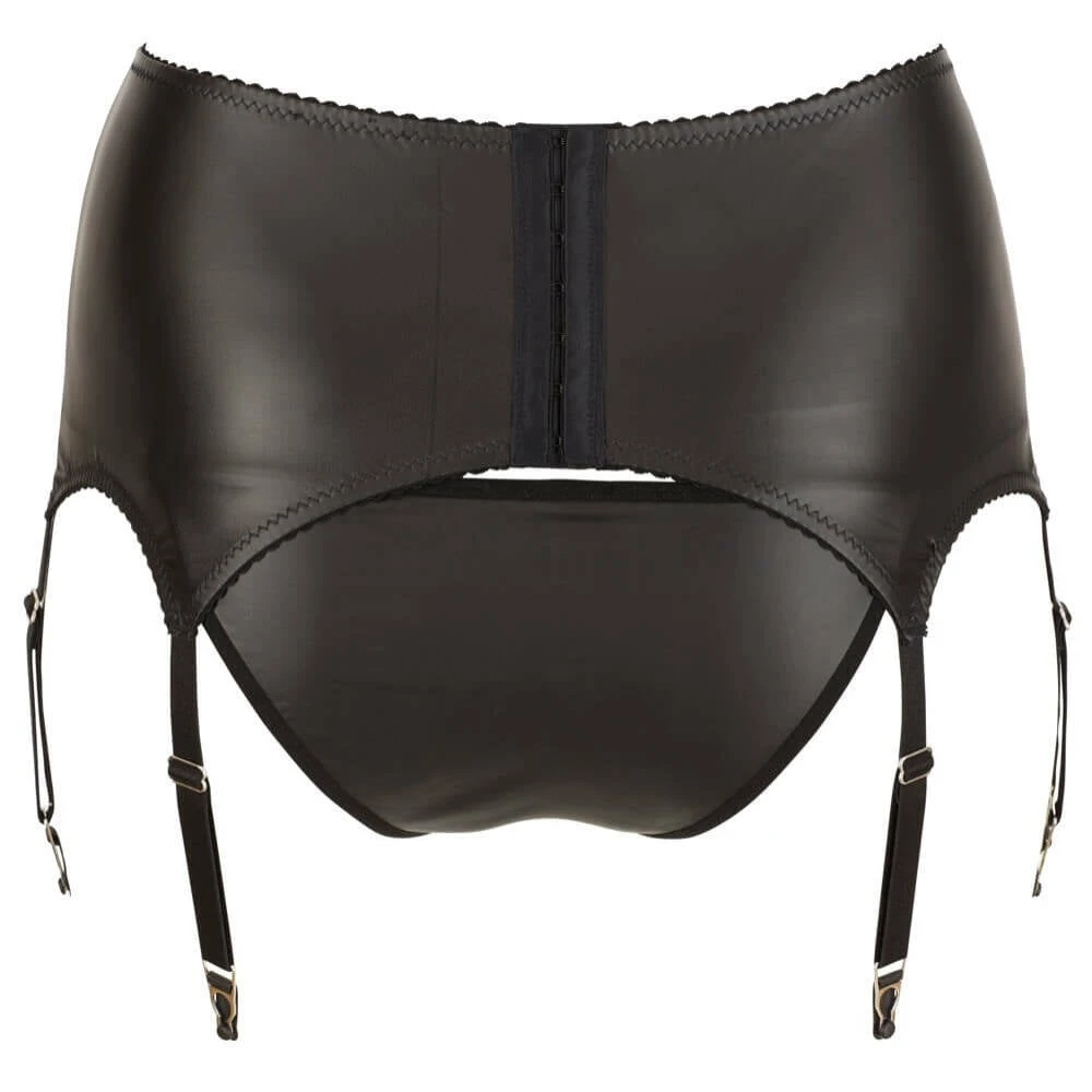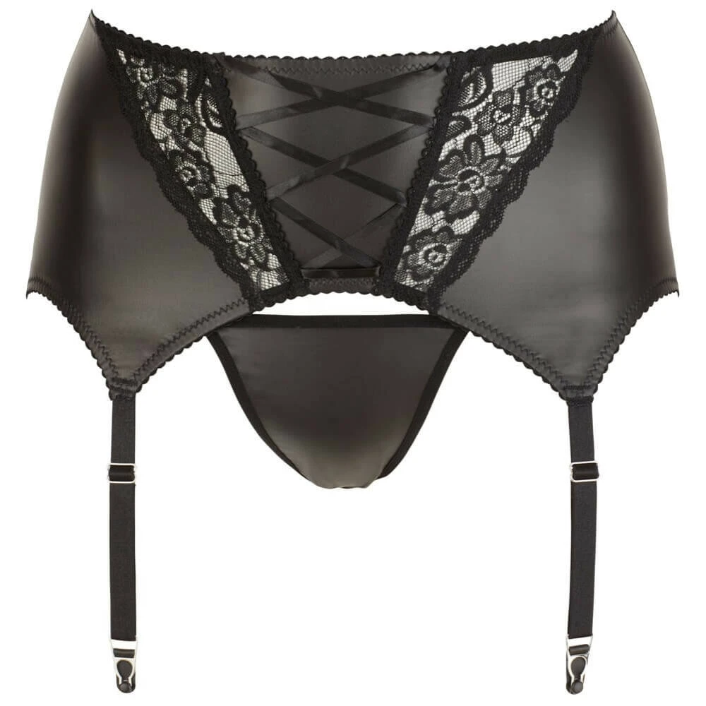 Black garter belt and panties made of shiny material. The garter belt has lace and decorative lacing at the front, 3 adjustable straps on each side and a hook fastening at the back. No stockings, no bra.