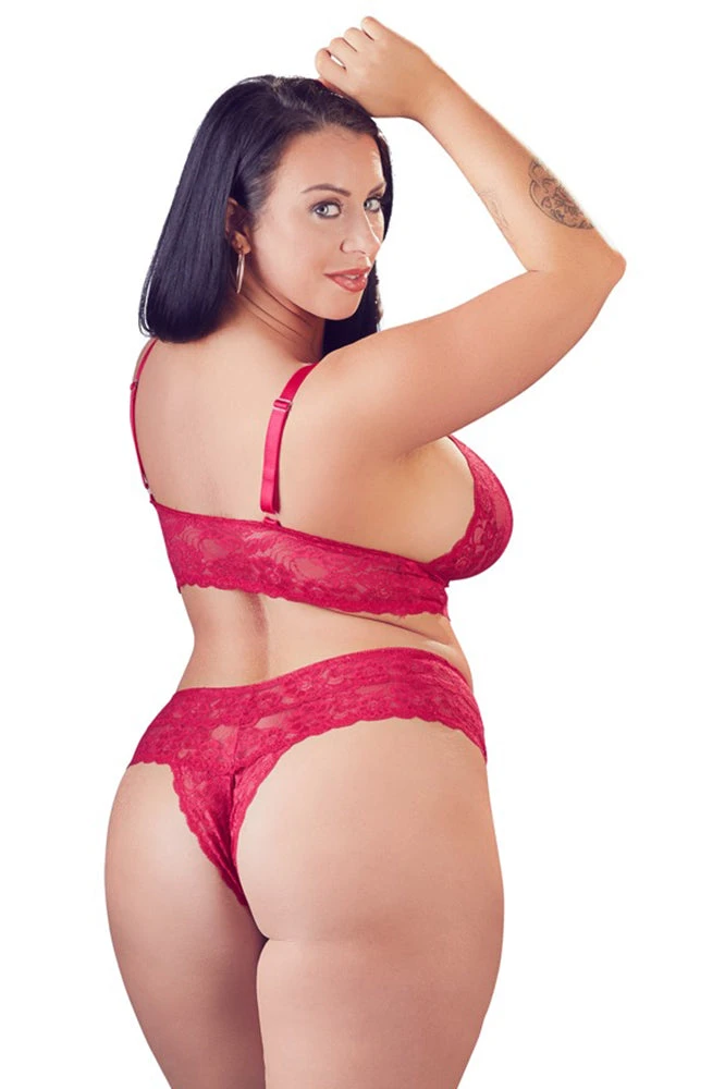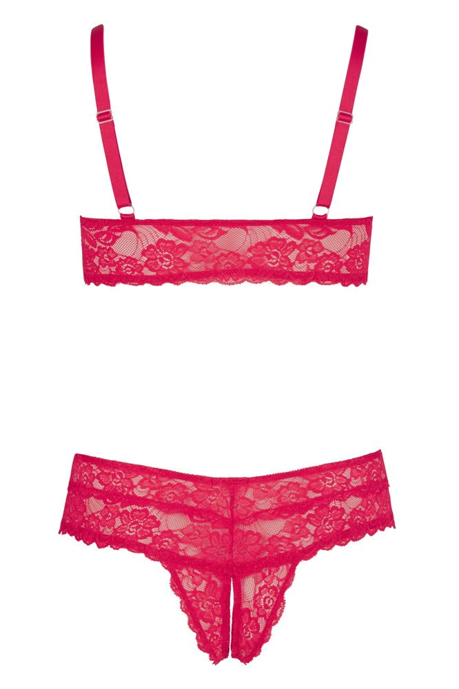 Intense seduction! Delicate red lace: wireless bra without fasteners and with adjustable straps. Fancy, crotchless briefs for passionate hours with your partner.