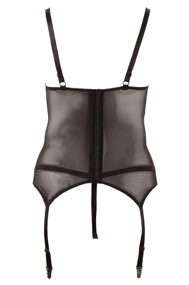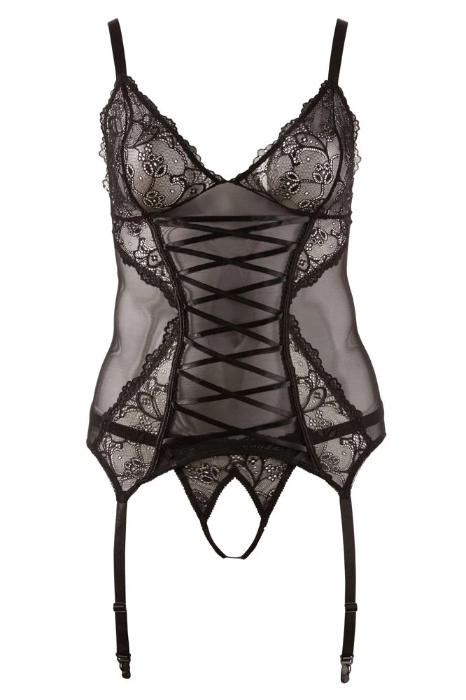 Set for hot curves! Cami suspender and crotchless string in a set. Black cami suspender made out of powernet and lace. Bra straps and the four suspender straps are adjustable. With a hook-fastener at the back. With a matching crotchless black lace string.