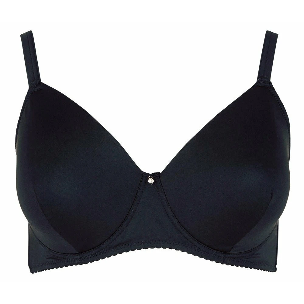 The black bikini bra stands out from the rest because of its slightly padded cups and a sparkly rhinestone in between them. With a bone at either side for a better fit, wide straps and a hook-fastener at the back.