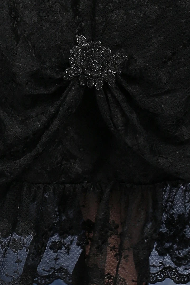 Double layered long gothic skirt. Top layer of lace over inner layer of black satin effect material with it’s own lace edging. Four decorative rose patches attached to bottom of skirt, elasticated waist adjusts from 24 to 36 inches approx, approx 37 inches long, one size fits most.