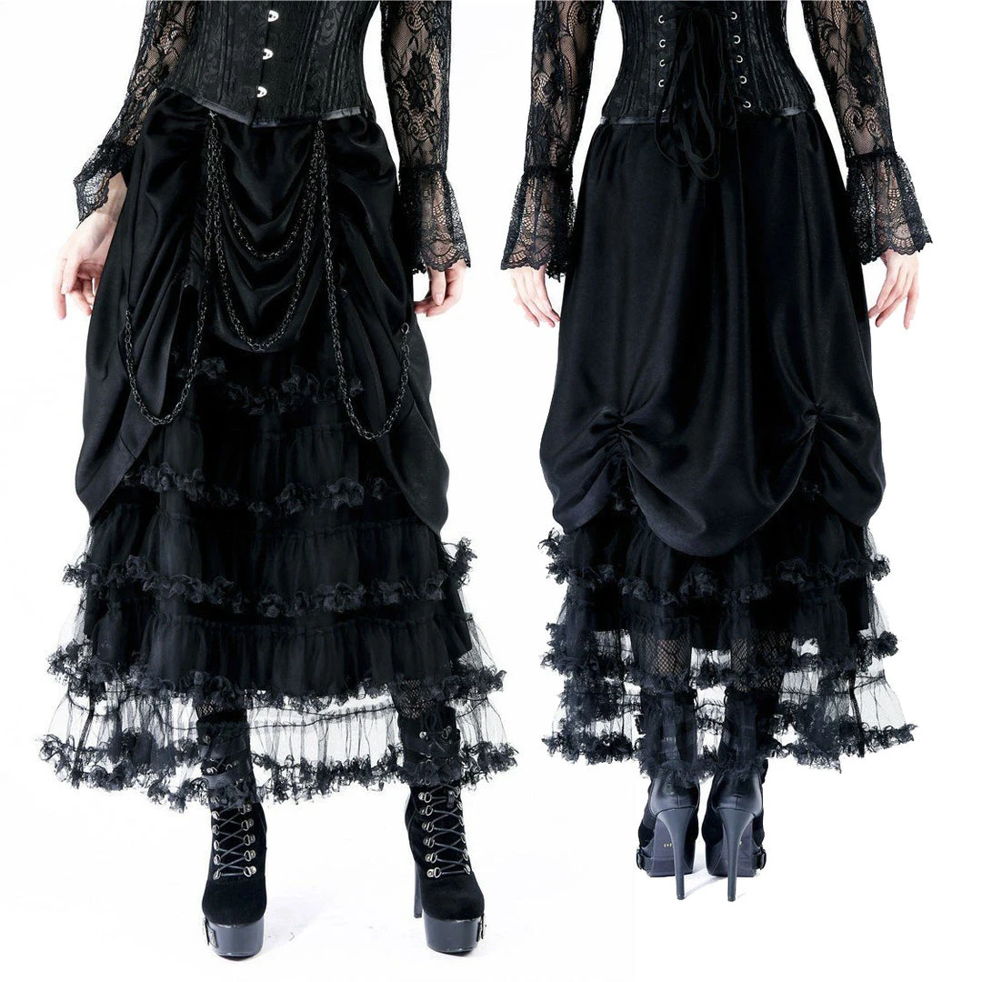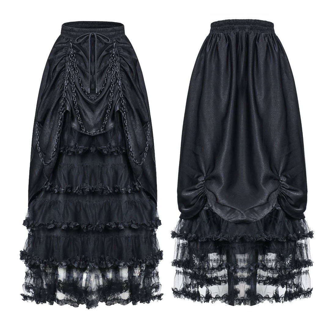This stunning long gothic skirt features a black matte satin type fabric on the top layer, which is gathered at the front and lower down on each side at the back revealing a tiered black net net underlayer with ruffle detailing. There is a black lining layer under this. The skirt has clip on black chains which attach with a lobster clasp to ribbon loops at each side on the front the waistband which hang to emphasize the gathered bustle effect at the front of the skirt. The waistband has a drawstring tie for adjustability.
