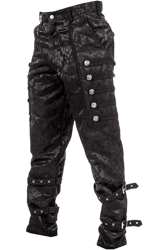 Mens Black Brocade Trousers with Black Braiding detail, military style buttons and black braiding down the side of each thigh and two black braided buckle straps on the lower legs. The trousers fasten with a zip and button fly. There is a pocket on each side at the front, and two pockets on the back with decorative button detail.
