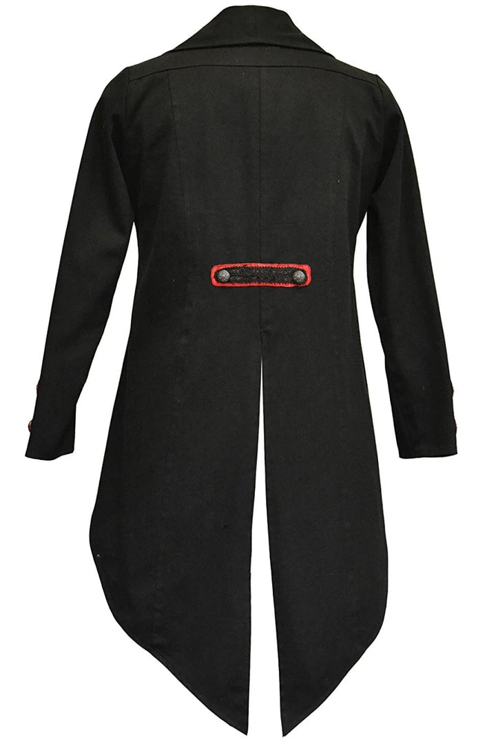 Dark Star Gothic Tail Jacket, Victorian Steampunk Tailcoat in Black Cotton with Black Braiding and red trim detail and Silver Buttons.