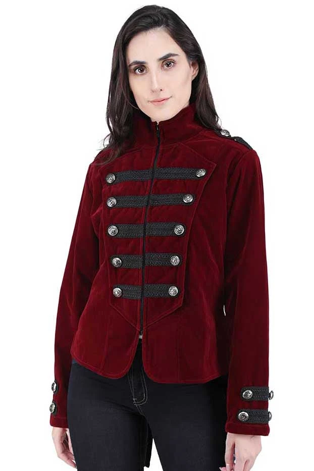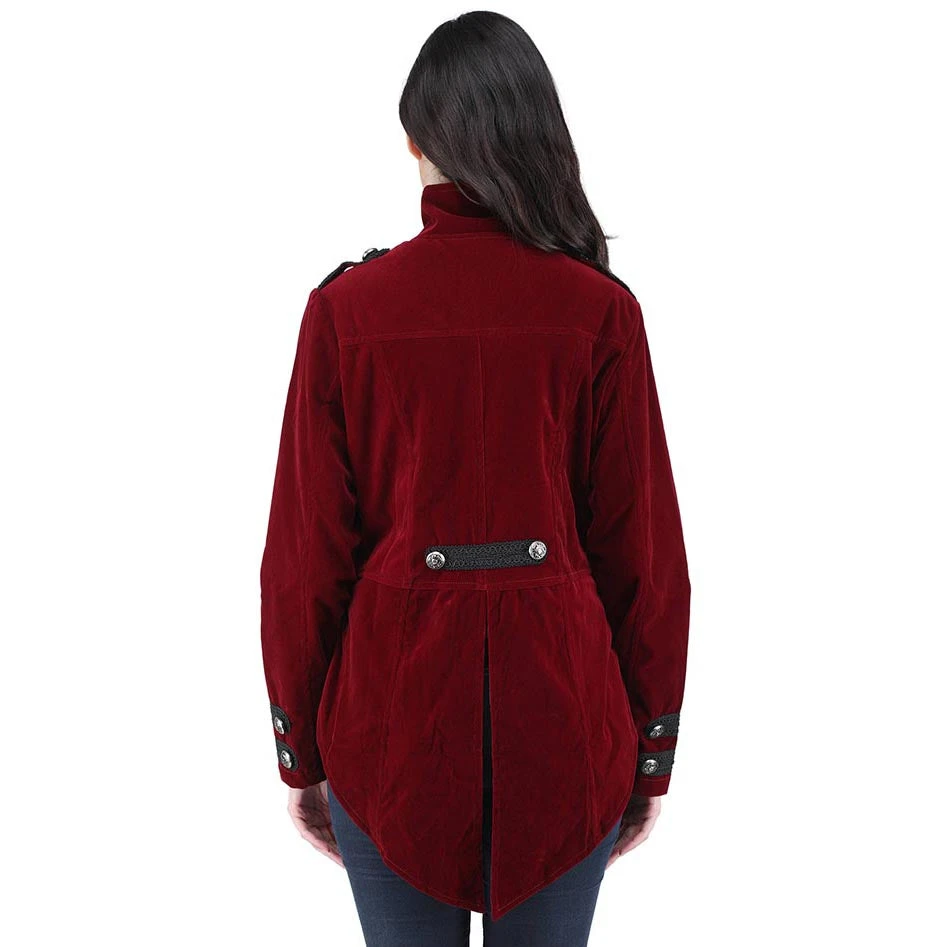 Dark Star Gothic Tail Jacket, Victorian Steampunk Tailcoat in Maroon Velveteen with Black Braiding Detail and Silver Buttons.