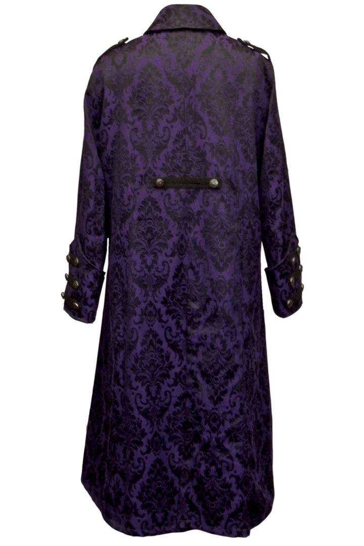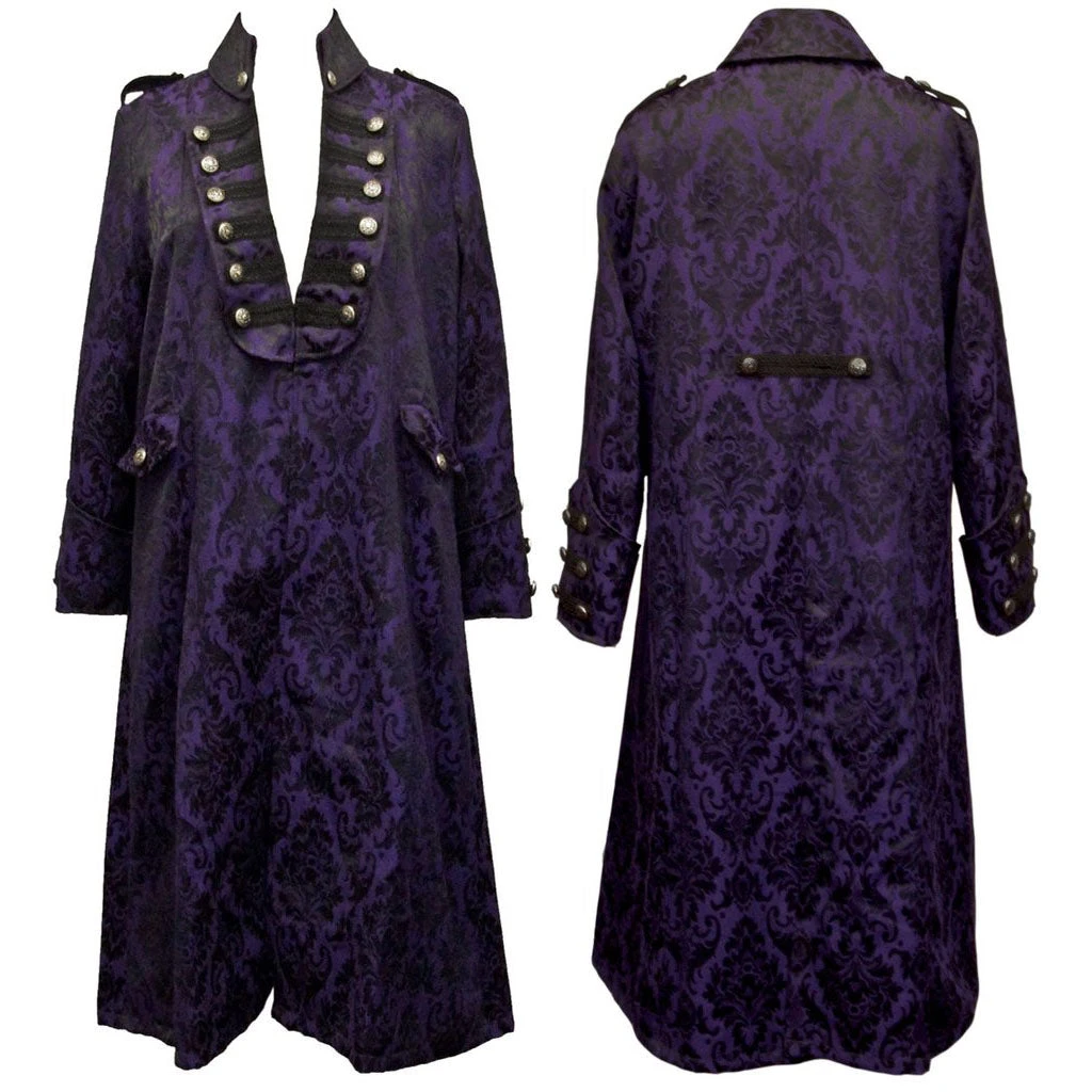 This eyecatching Purple brocade pirate coat is full length and features braid trimmed lapels and cuffs also with black braiding detail and silver tone buttons for a Napoleonic Military Uniform style look. The coat has hook and eye fastening at the front and a pocket with button fastening at each side. This dramatic coat would make a great finishing touch to your traditional gothic or Military Steampunk outfit!