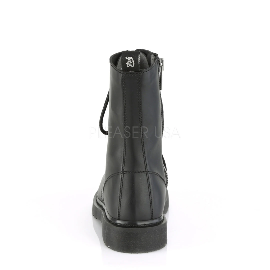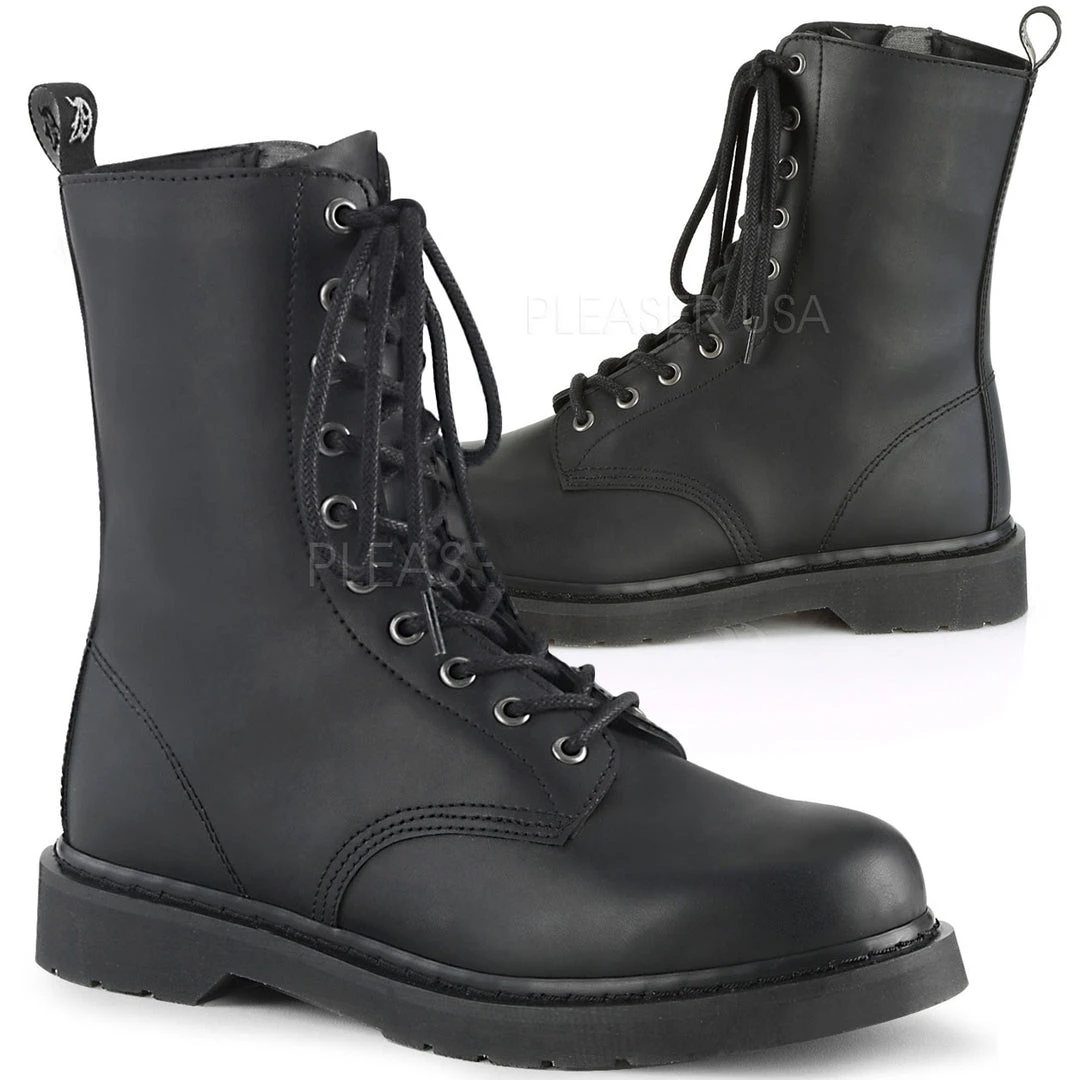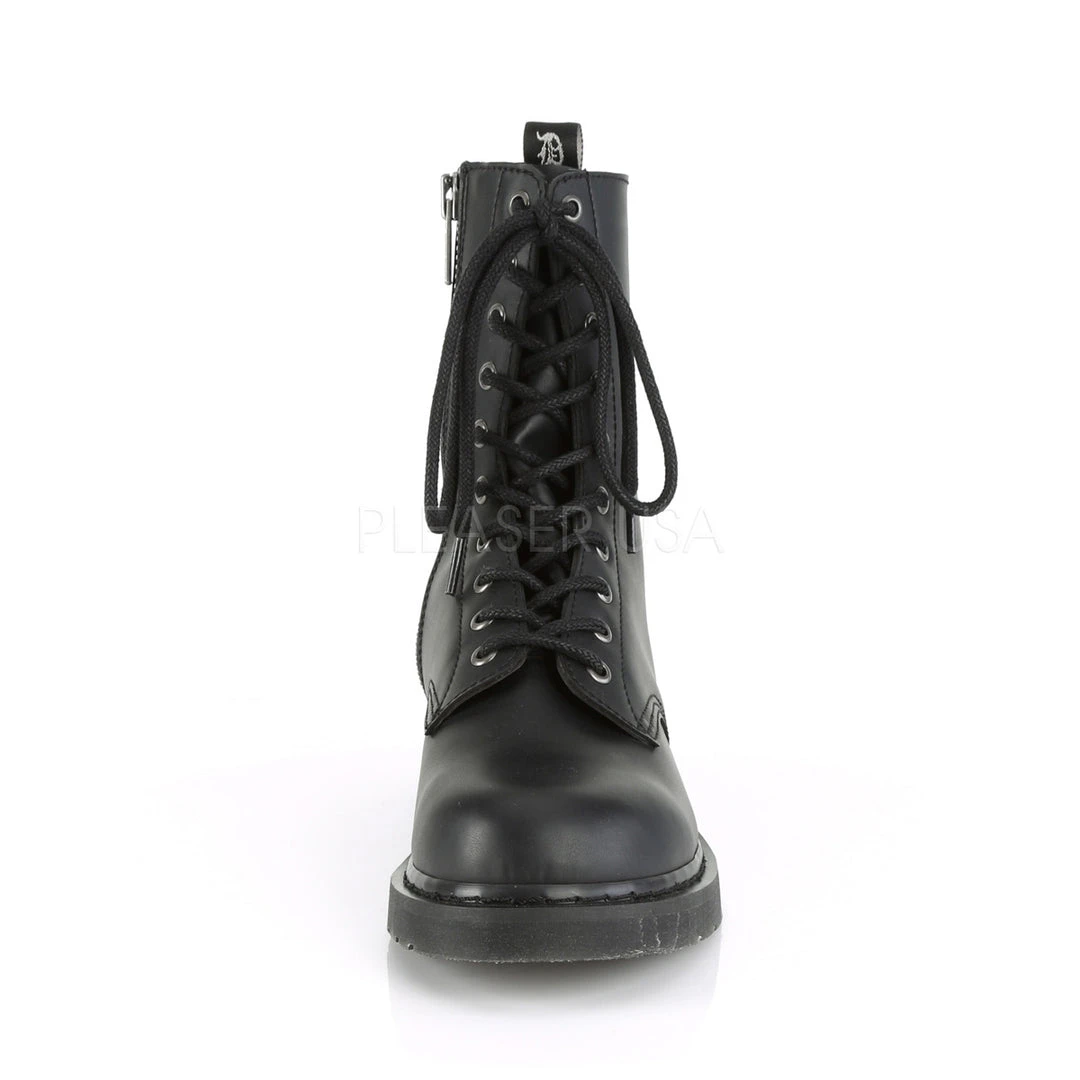 Black Vegan Leather. 1 1/4″ (32mm) Stacked Flat Heel 10-Eyelet Lace-Up Mid Calf Unisex Vegan Boot with Back Pull-Tab, Inside Zip Closure.
