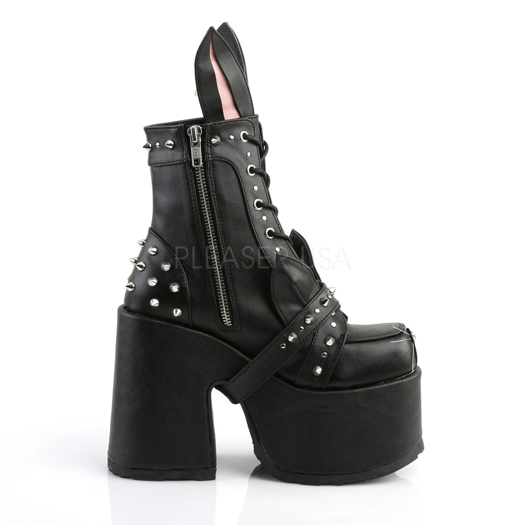 5″ (12.7cm) Chunky Heel, 3″ (7.6cm) Platform Lace-Up Front Ankle Boot Featuring Interchangeable Cat / Bunny Ear Design and Spike and Stud Detail, Inside Zipper Closure.