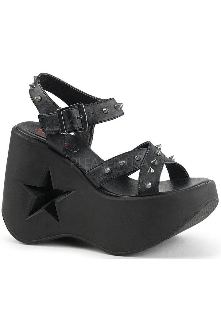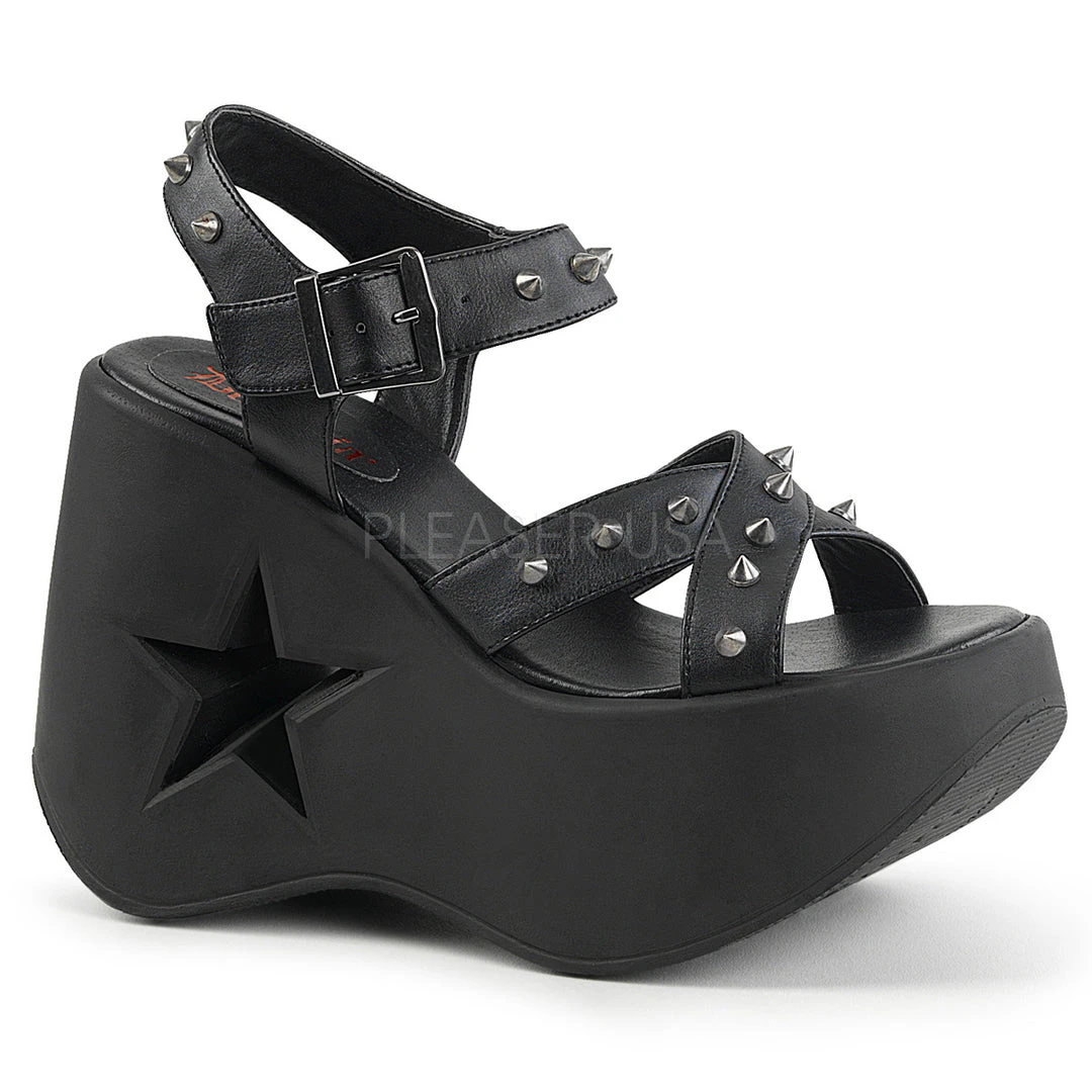 5″ (12.7cm) Star Cutout Platform Wedge Criss Cross Ankle Strap Sandal with Cone Spike Detail.