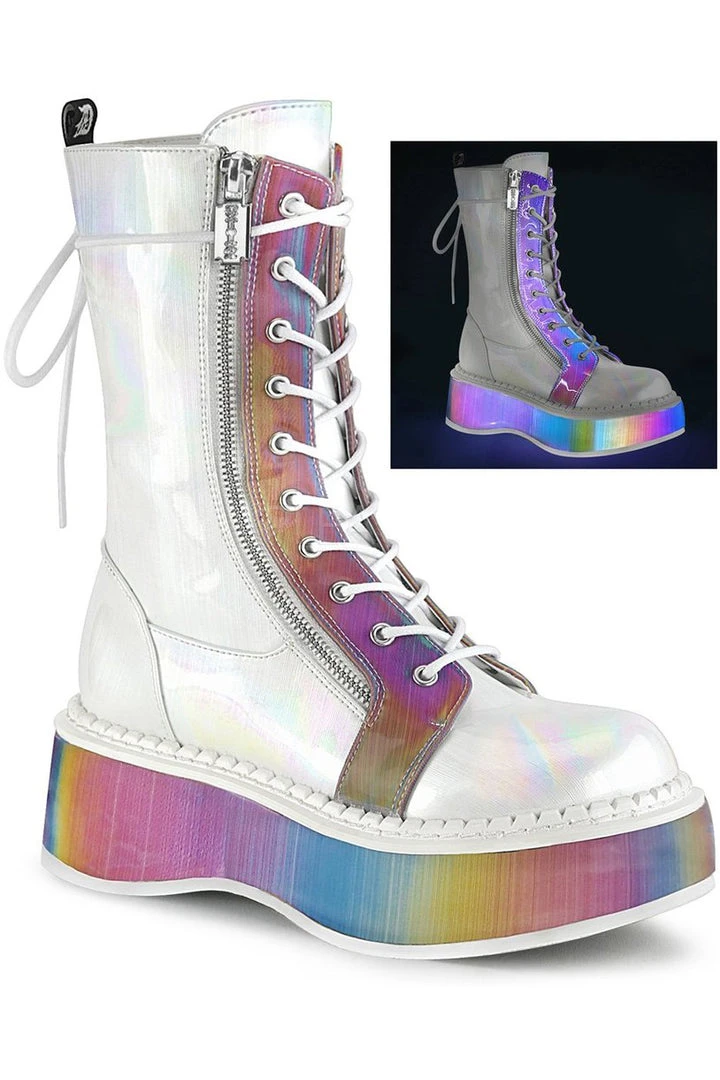 Demonia Ladies White Brushed Hologram Vegan Leather, Rainbow Reflective EMILY-350 Boots.