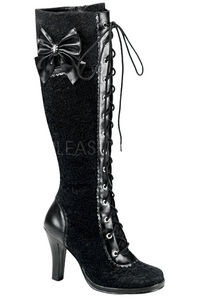 3 3/4″ (9.5cm) Heel, 1/2″ (1.3cm) Platform Goth Lolita Lace Up Knee Boot with Bow Mini Platform, Full Inner Size Zipper.