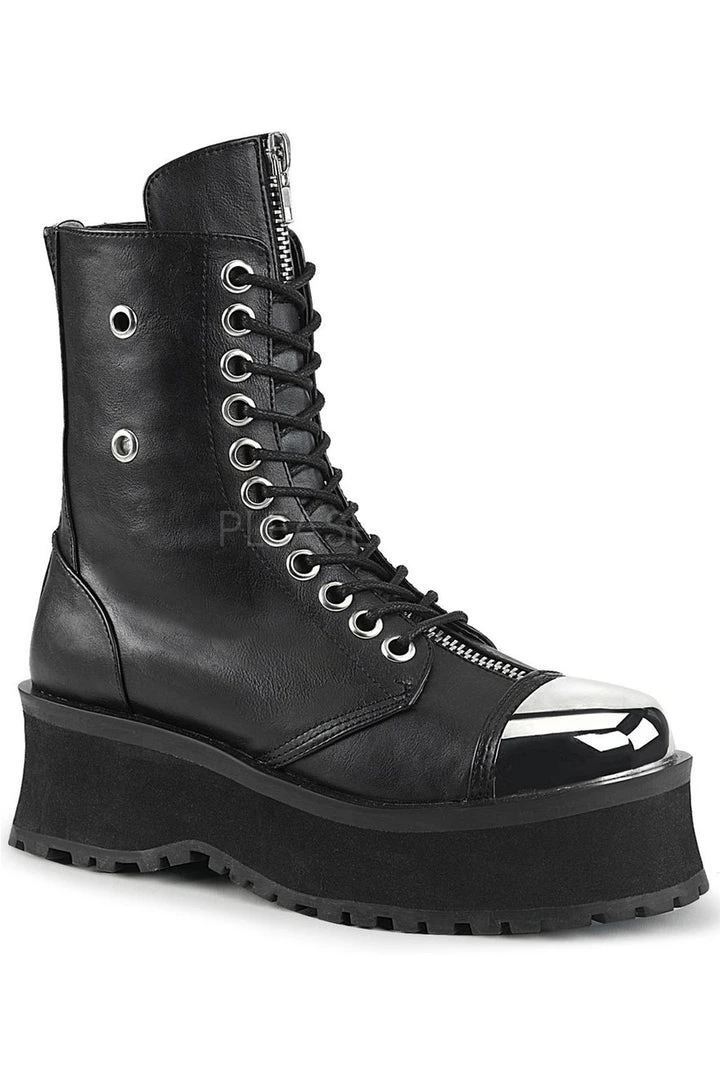 2 3/4″ Platform Lace-Up Ankle Boot With Silver Chrome Plated Metal Toe Cap and Zipper Details, Metal Back Zip Closure.