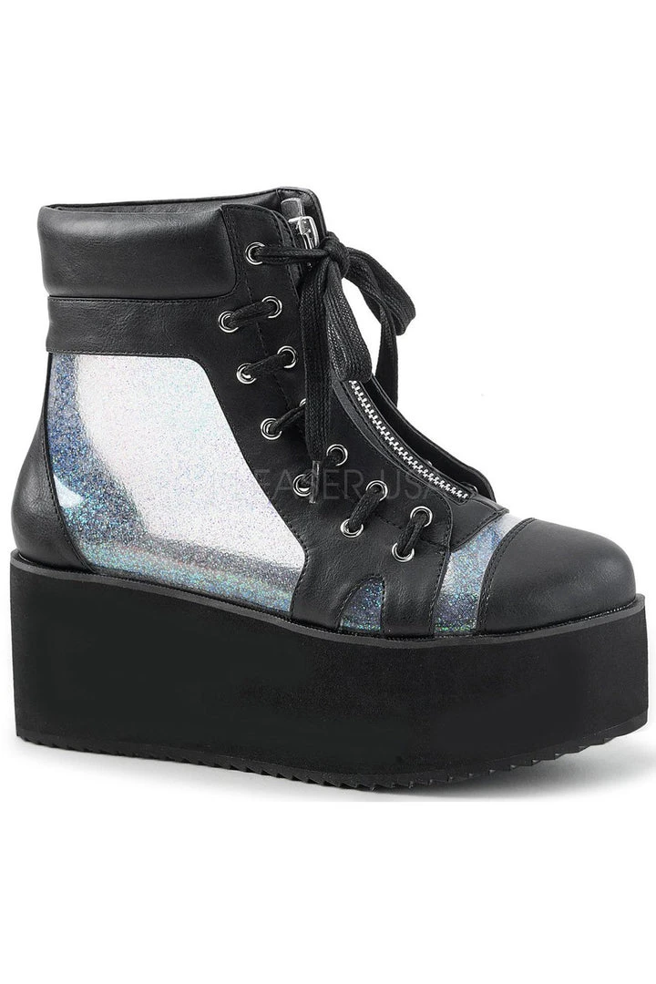 Demonia Black Vegan Leather, Clear Hologram TPU GRIP-102 Boots.