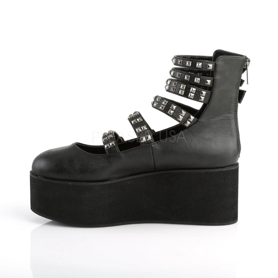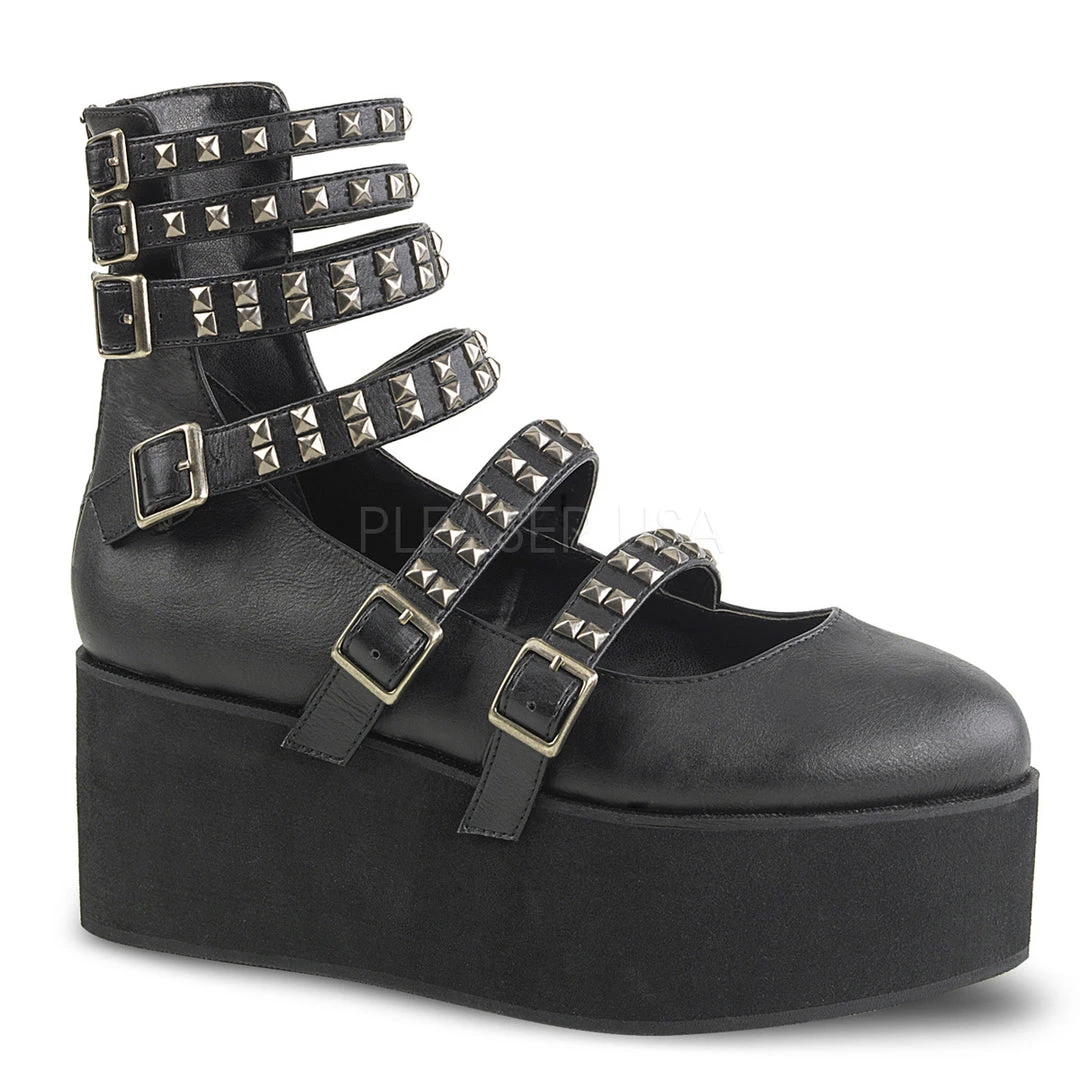 2 3/4″ (7cm) Platform Strappy Mary Jane with Mini-Pyramid Studs on Straps, Back Zip Closure.